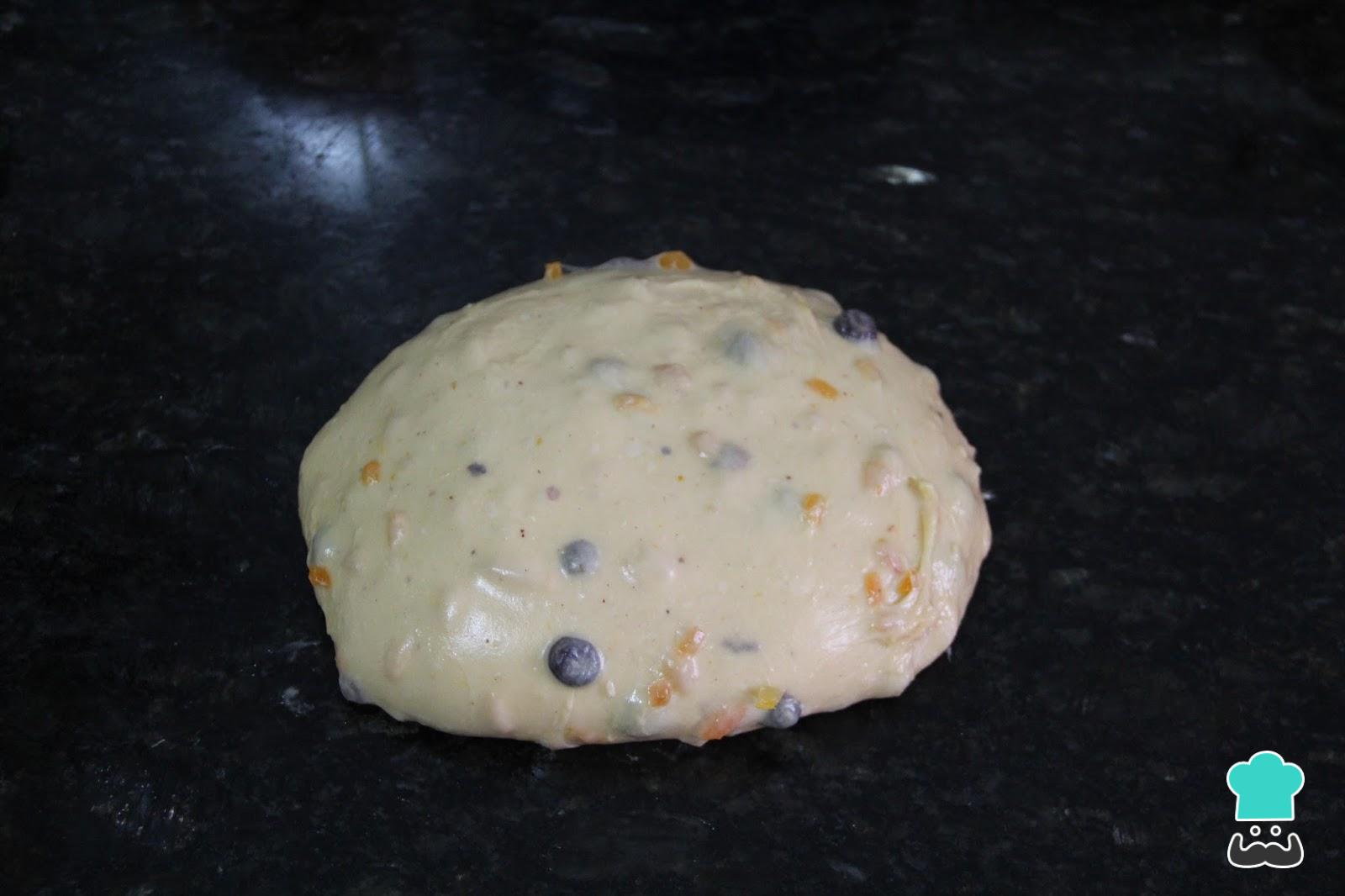 De seguida, bata a mistura até formar bolhas. Cubra o recipiente da massa com um pano e deixe crescer por cerca de 40 minutos. Quando terminar o descanso, junte as frutas, a castanha e as uvas-passas e volte a misturar.