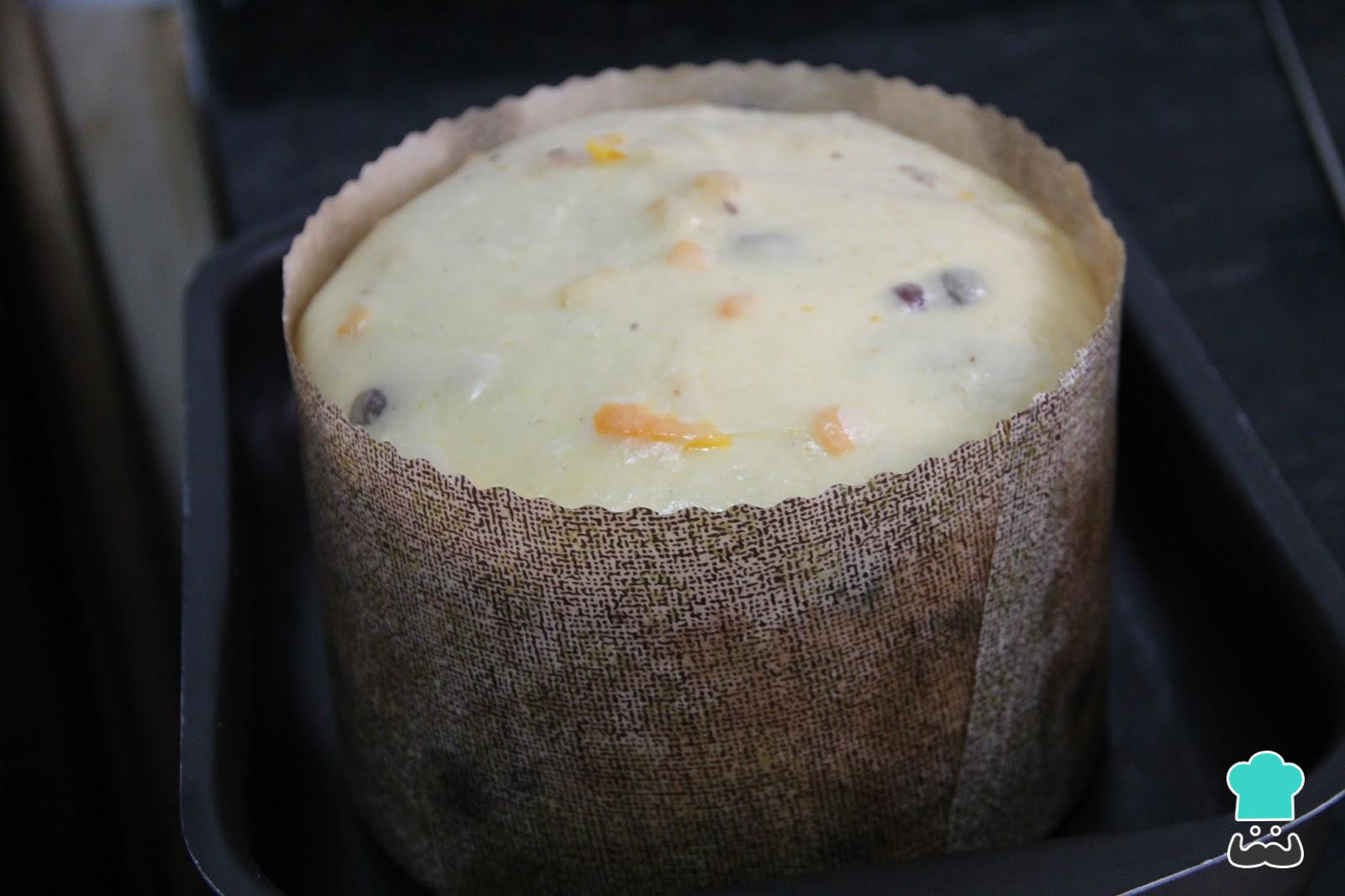 Unte e enfarinhe uma forma para panetone. Adicione a massa e deixe descansar por meia hora. De seguida, faça um corte em cruz no topo do panetone, pincele com a gema batida e asse no forno preaquecido a 220 º C por 40 a 50 minutos.