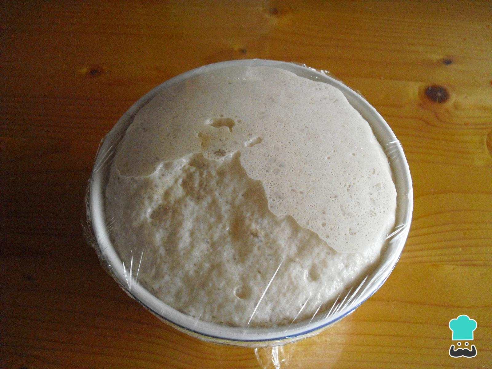Para fazer a esponja de panetone trufado, misture a farinha e 60 ml de água e bata até obter uma massa. De seguida, junte o resto da água e o fermento. Bata por 5 minutos até obter uma massa homogênea. Modele uma bola, cubra com filme plástico e deixe descansar por 1 hora.