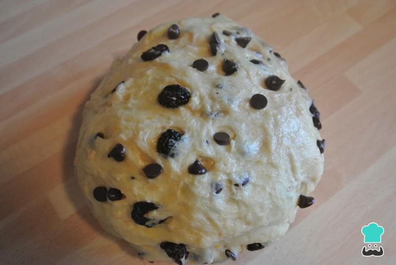 Para fazer a massa principal, misture a farinha, a água, o sal, 4 gemas de ovo e a mistura de panetone (por essa ordem) e bata até ficar homogêneo. Misture essa massa com a esponja do passo anterior e junte as gotas de chocolate.