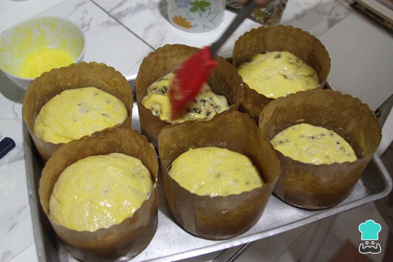 Coloque as porções de massa em formas de papel para panetone, deixe repousar por mais 3 horas e cubra com gema de ovo batida. Se optou pelo panetone trufado grande, asse por 45 minutos a 170 º C. Caso tenha modelado os pequenos, asse por 35 minutos apenas (na mesma temperatura).