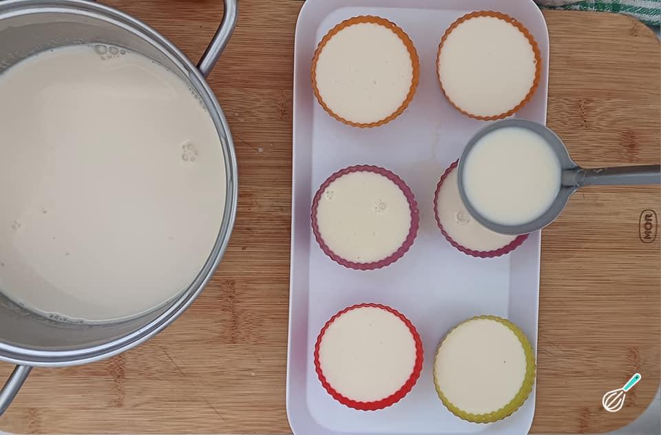 Transfira o creme para forminhas de silicone untadas levemente com óleo ou em taças individuais que não precisam ser untadas, pois neste caso não iremos desenformar. Leve as panna cottas até a geladeira por pelo menos 2 horas ou até firmar. Enquanto isso, pode preparar a calda de maracujá.