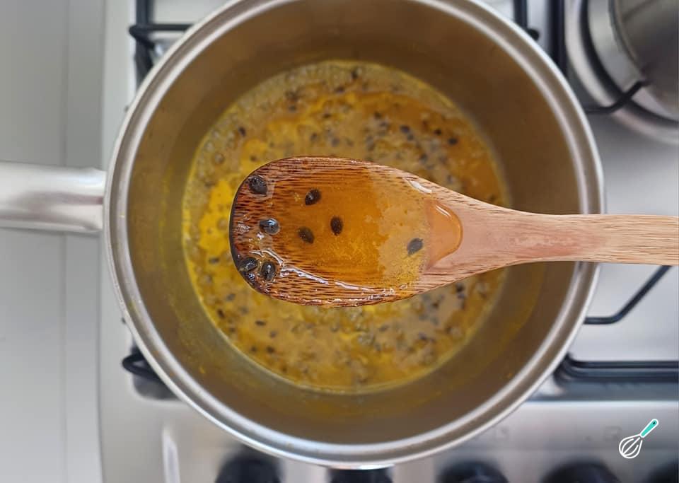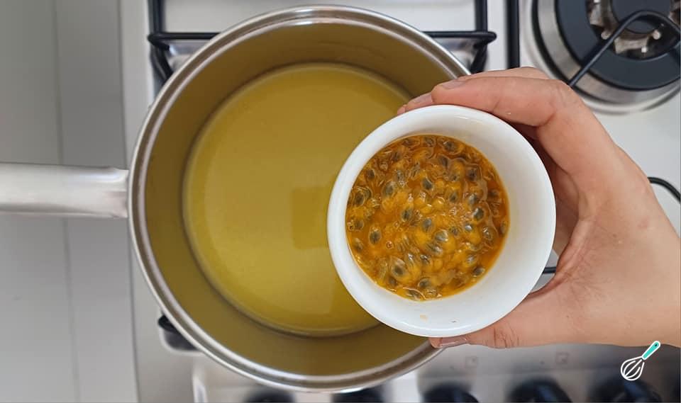 Cozinhe a calda de maracujá em fogo baixo por cerca de 8 minutos ou até reduzir e engrossar levemente.