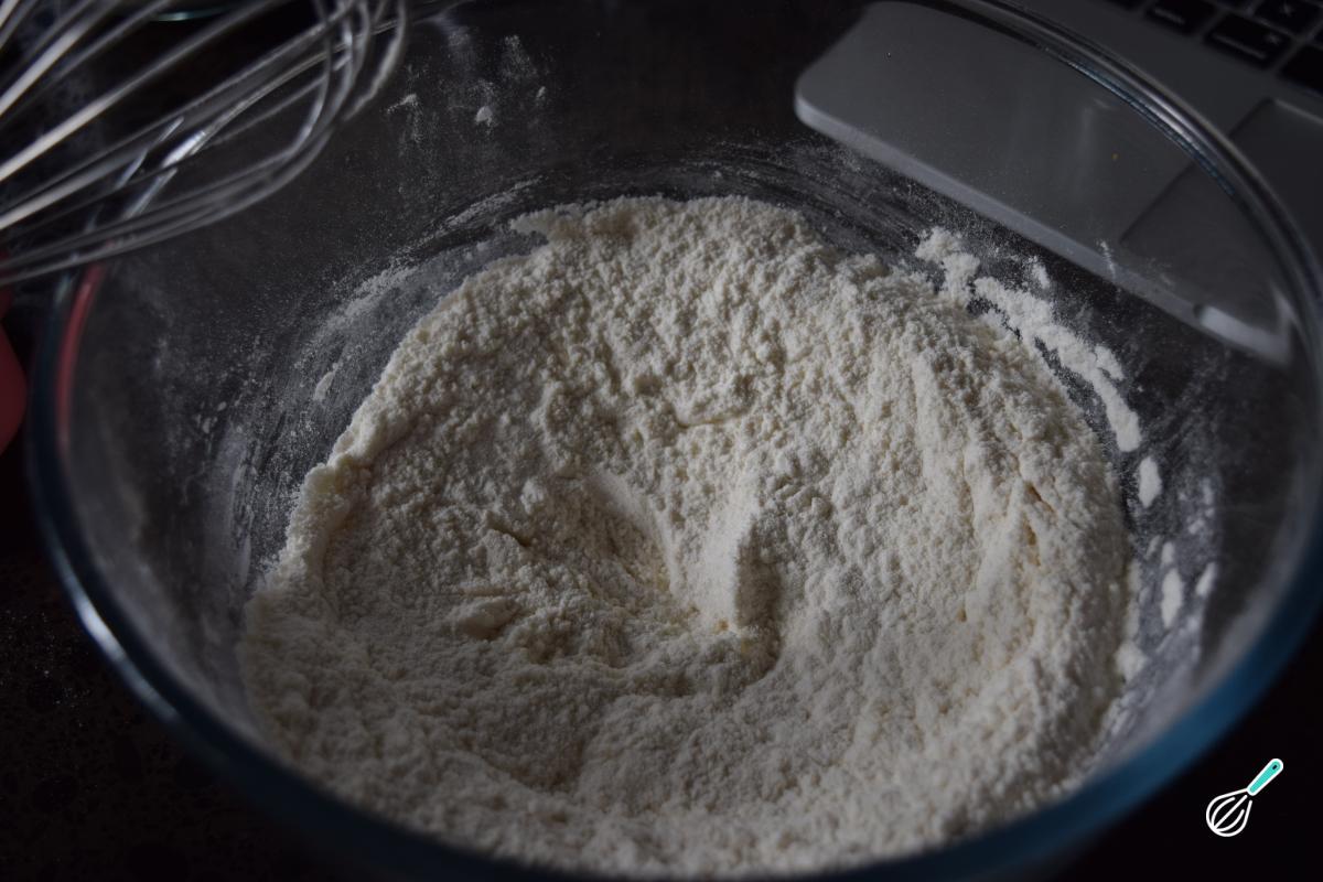 Para fazer estas panquecas caseiras, o primeiro passo é reunir os ingredientes. Depois misture em uma tigela os ingredientes secos (a farinha, o açúcar, o fermento e o sal), de preferência peneirados.