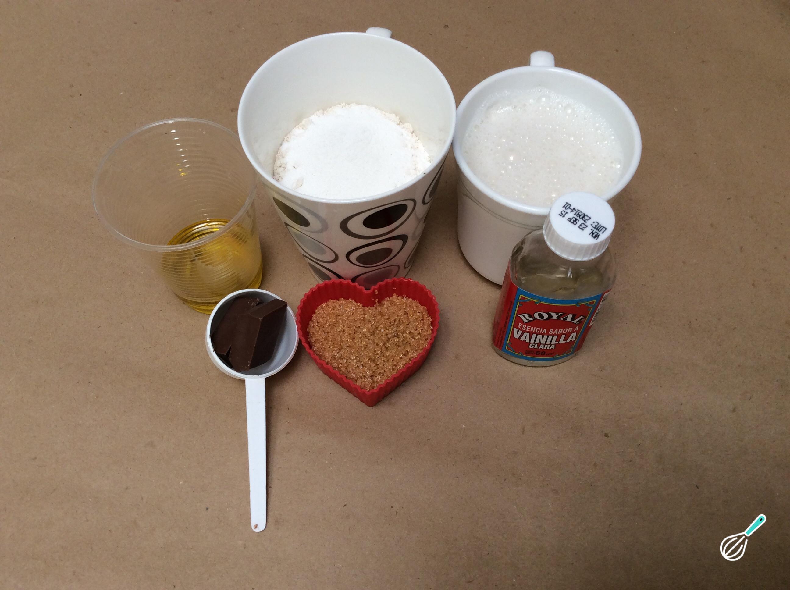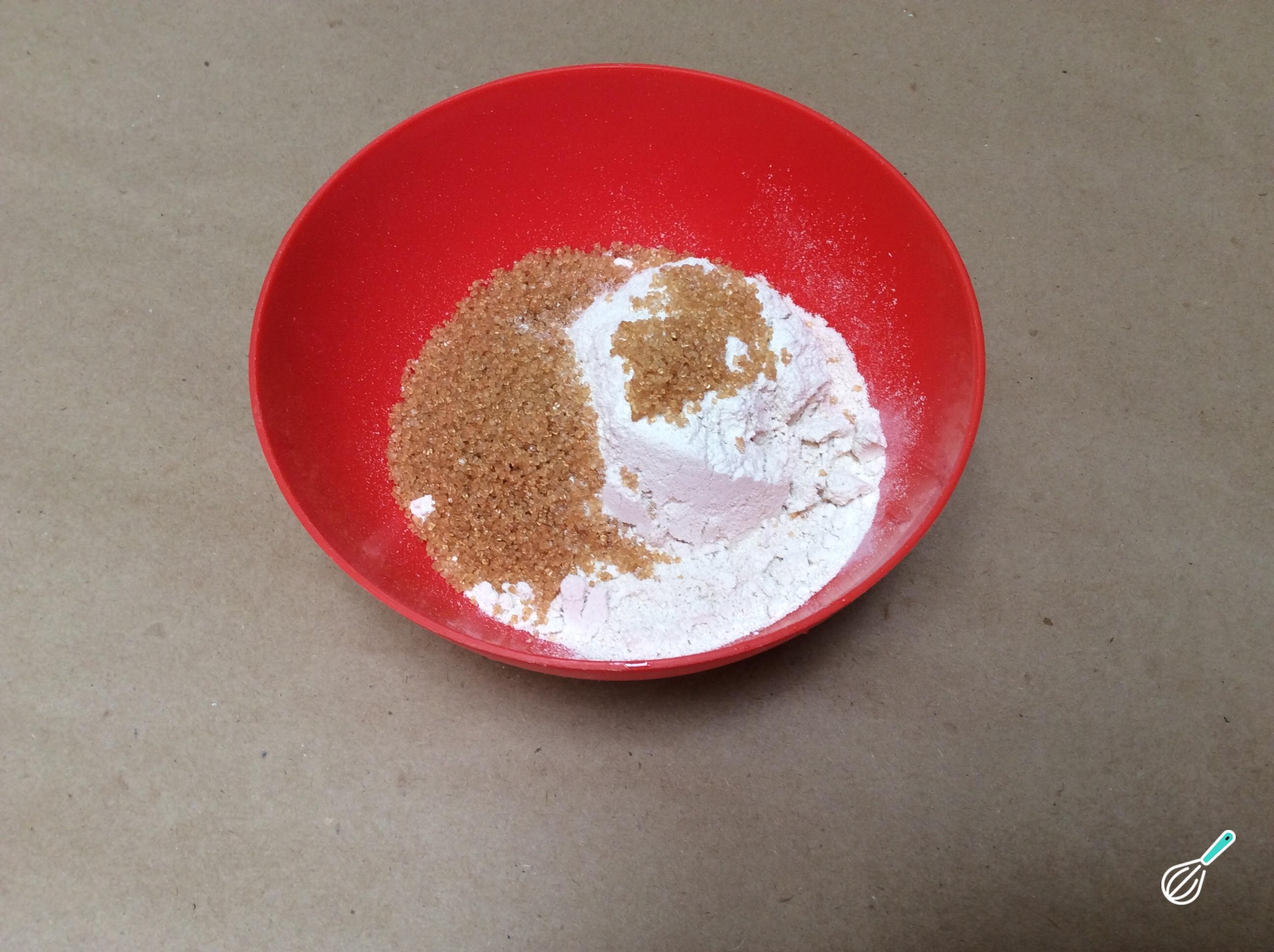 Coloque os ingredientes secos em uma tigela, ou seja, a farinha, o açúcar e o fermento em pó. Misture.