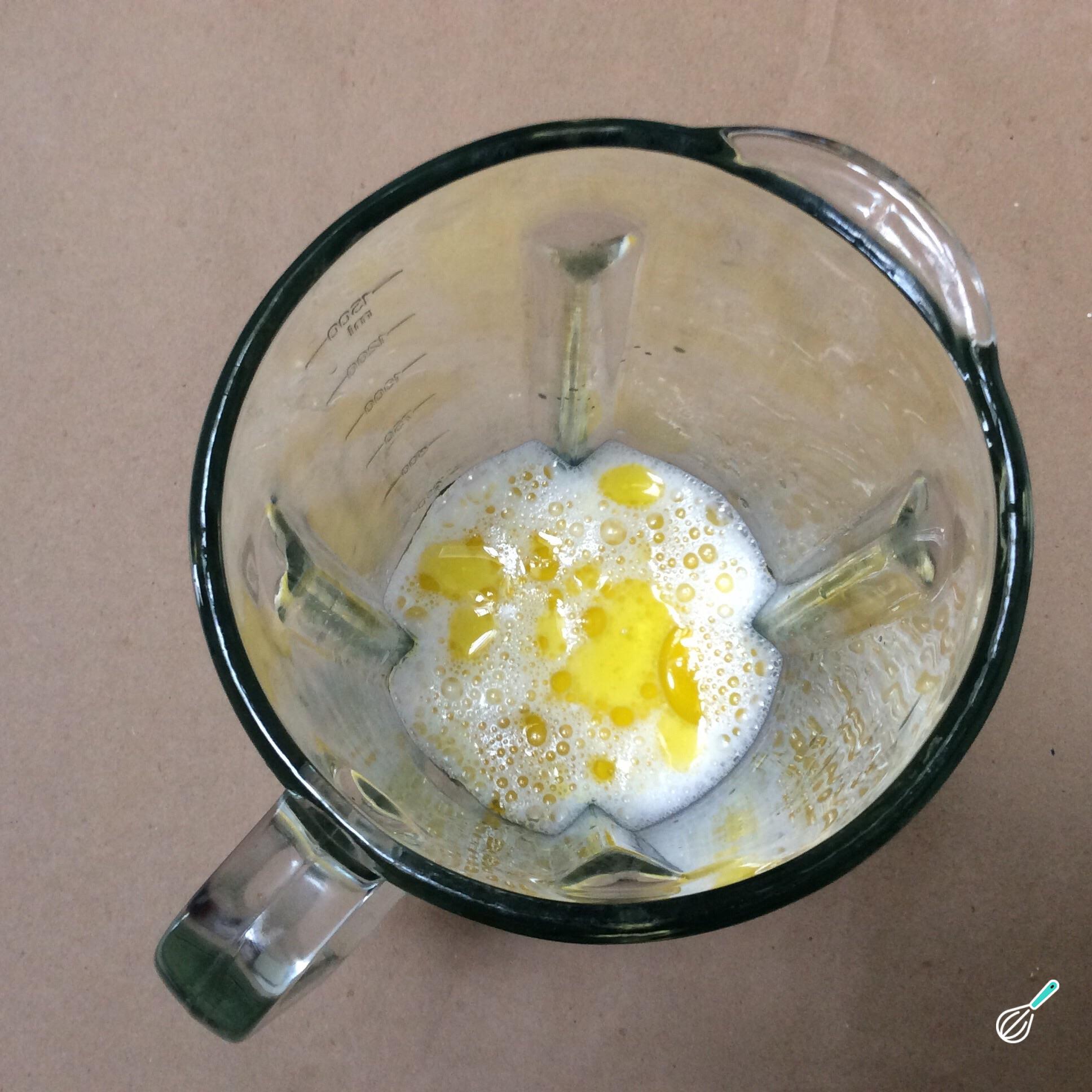 No liquidificador coloque os ingredientes líquidos: o leite, o azeite e a essência de baunilha. Bata durante alguns secos, acrescente os ingredientes secos e volte a bater, até obter uma massa de panqueca americana homogênea e ligeiramente líquida.