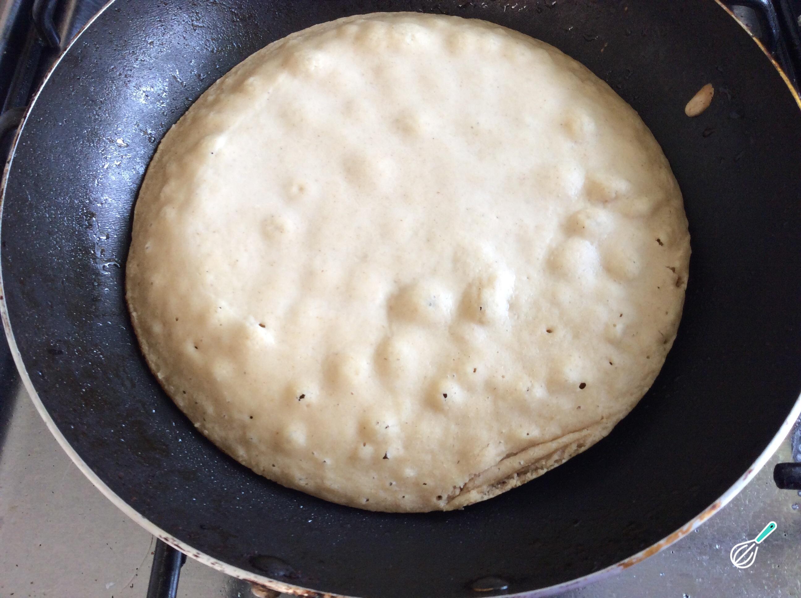 Em uma frigideira com um pouco de óleo, adicione 3 colheres de sopa da mistura anterior e agite a frigideira, para que a massa se espalhe. Cozinhe em fogo médio por 3 minutos e, quando começarem se formando bolhinhas, vire ao contrário e cozinhe do outro lado por mais 3 minutos.