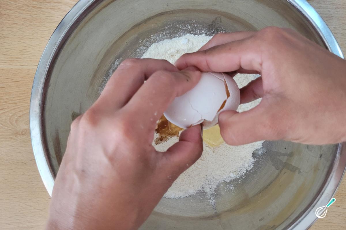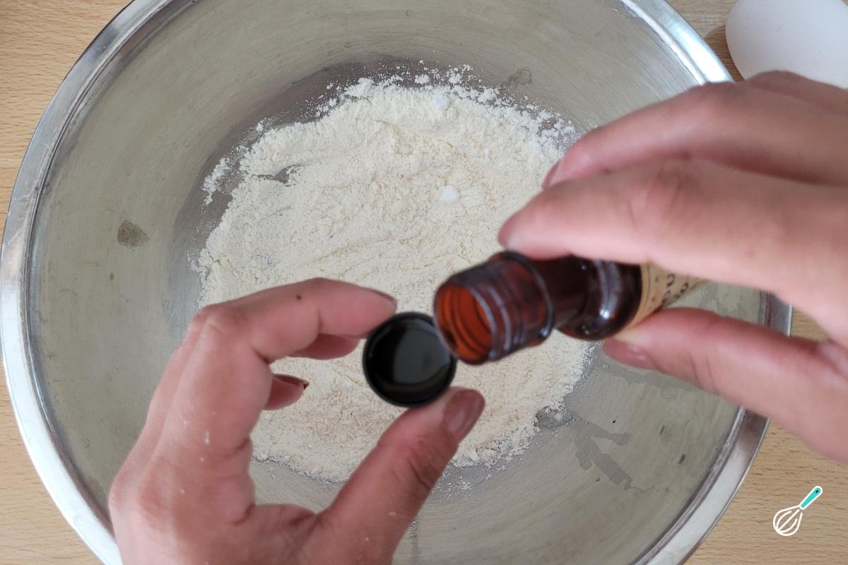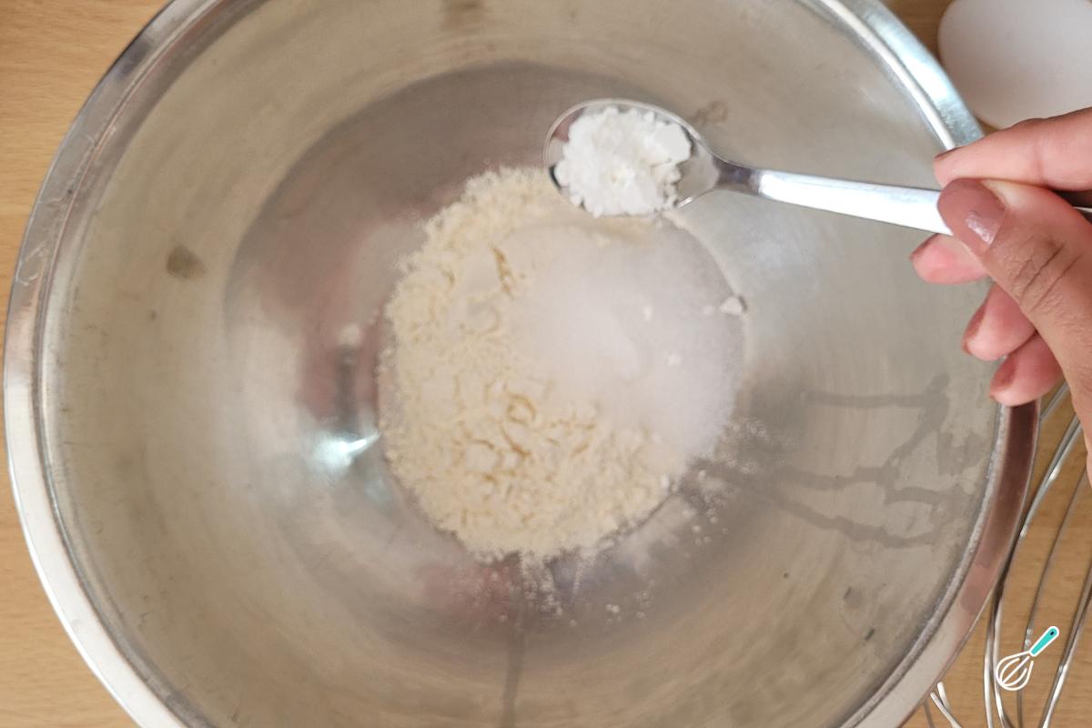 Em uma tigela grande, coloque os ingredientes secos: farinha, açúcar e o fermento.