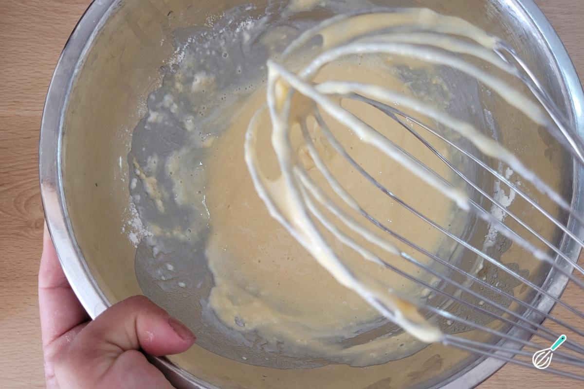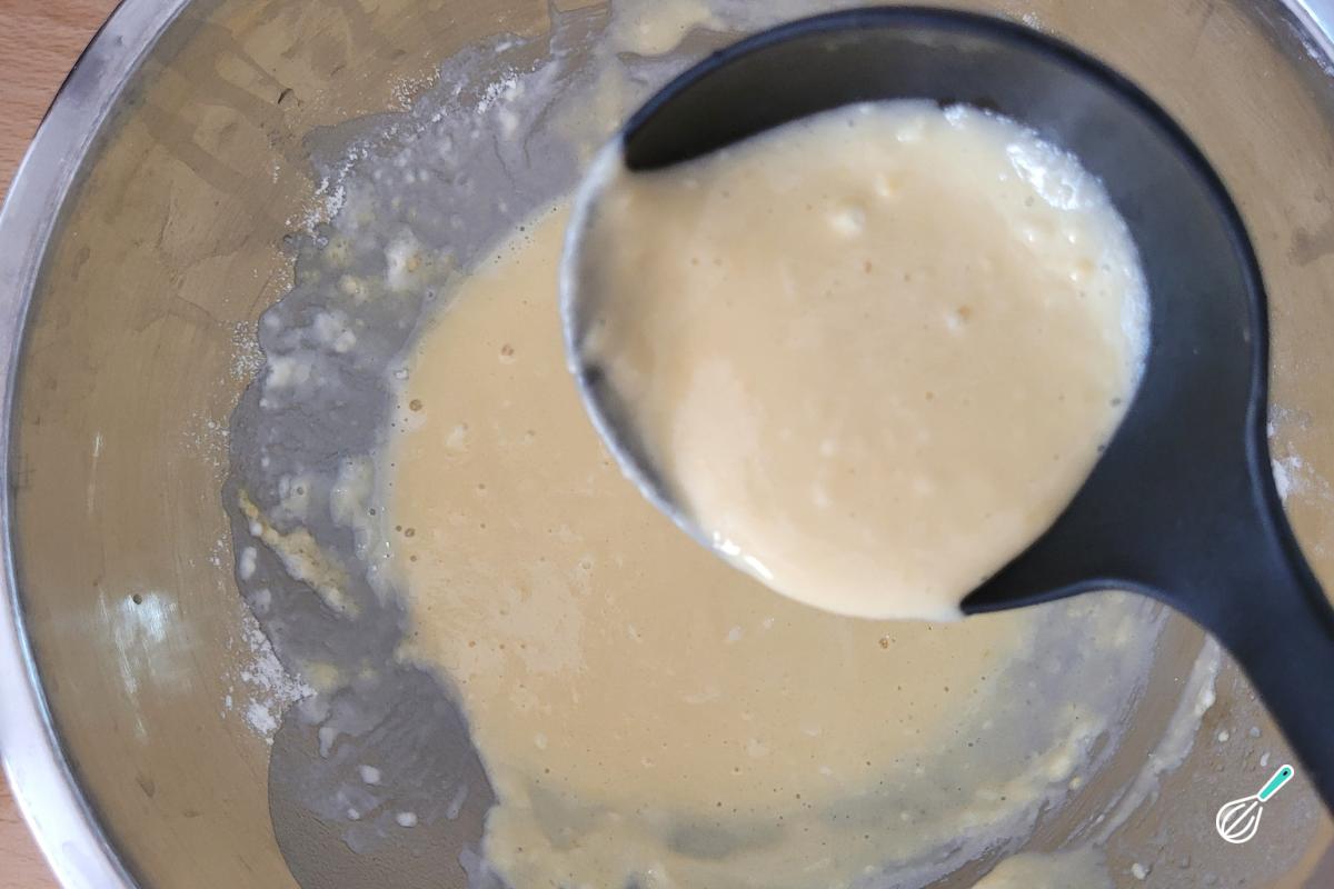 A massa precisa ficar fluida, mas sem ficar líquida demais. Deve ser mais consistente que uma massa de crepe, para que não espalhe demais na frigideira e forme os discos mais grossinhos do tamanho de panquecas. Por isso é importante colocar a água aos poucos.