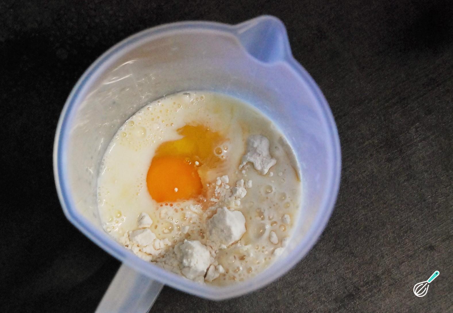 Coloque a farinha em uma tigela e acrescente o ovo e o leite. Misture bem até que esses ingredientes estejam integrados e quase não haja grumos.
