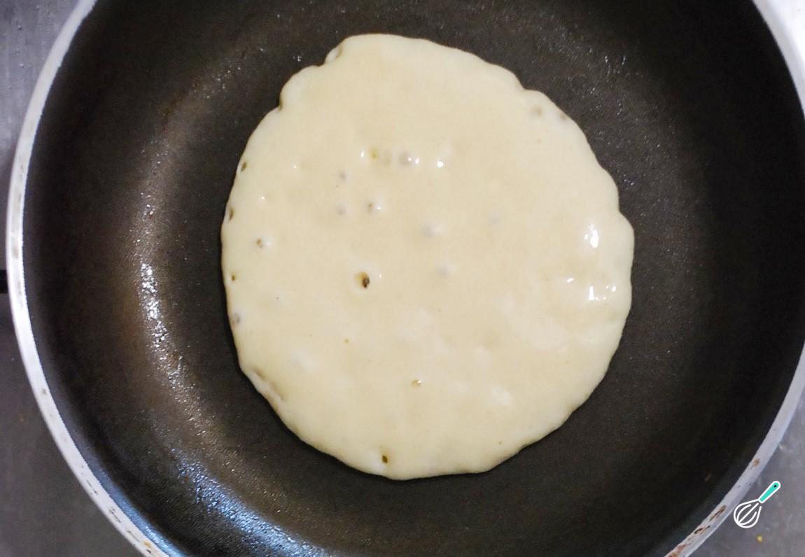 Para fazer as panquecas, aqueça uma frigideira em fogo médio-baixo com um pouco de azeite ou manteiga. Quando a panela estiver quente, adicione uma colher de sopa da mistura e deixe no fogo até começarem a aparecer bolhas na superfície, depois vire e cozinhe do outro lado.
