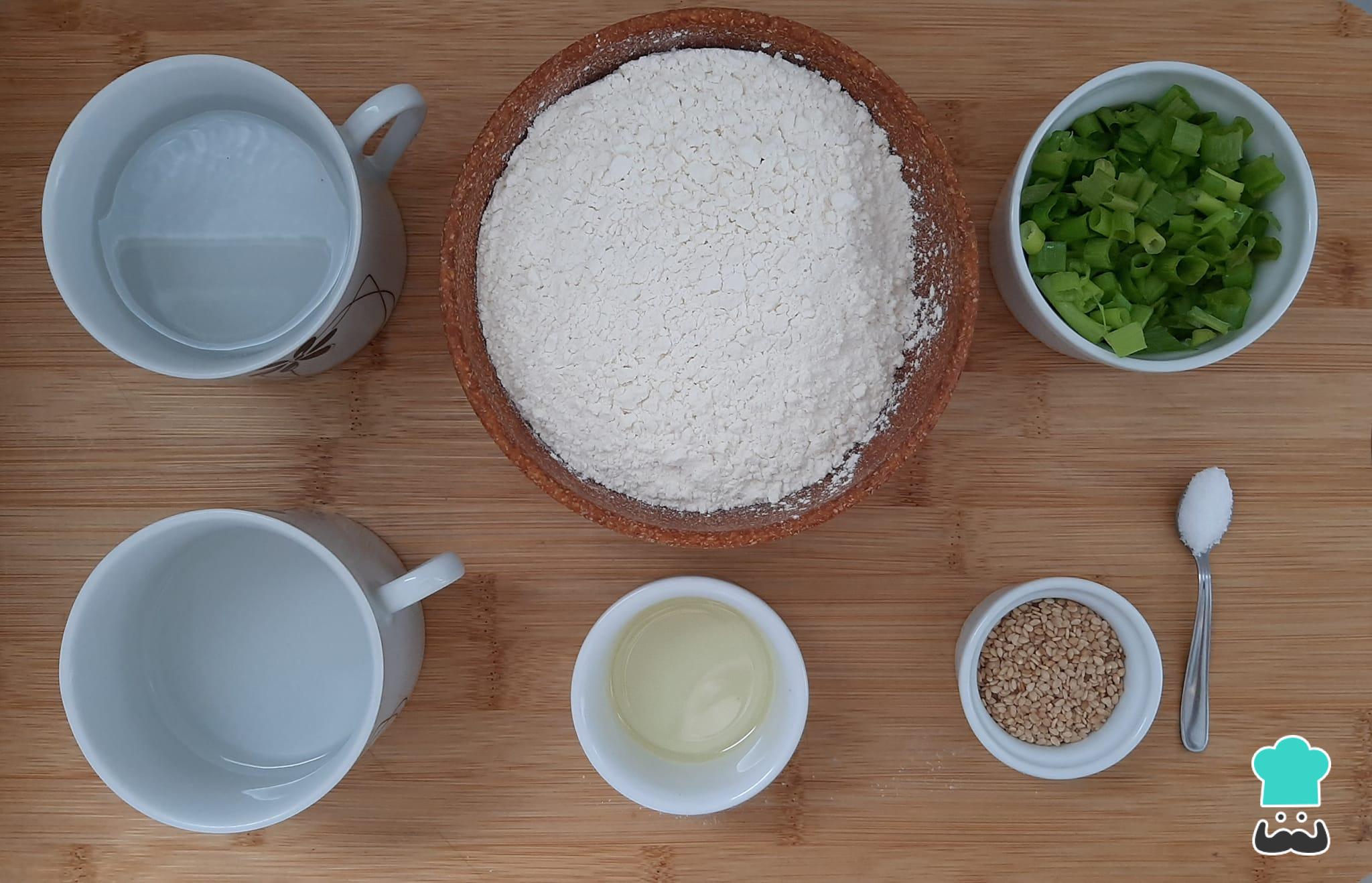 Separe os ingredientes necessários para preparar a panqueca chinesa com cebolinha e gergelim.