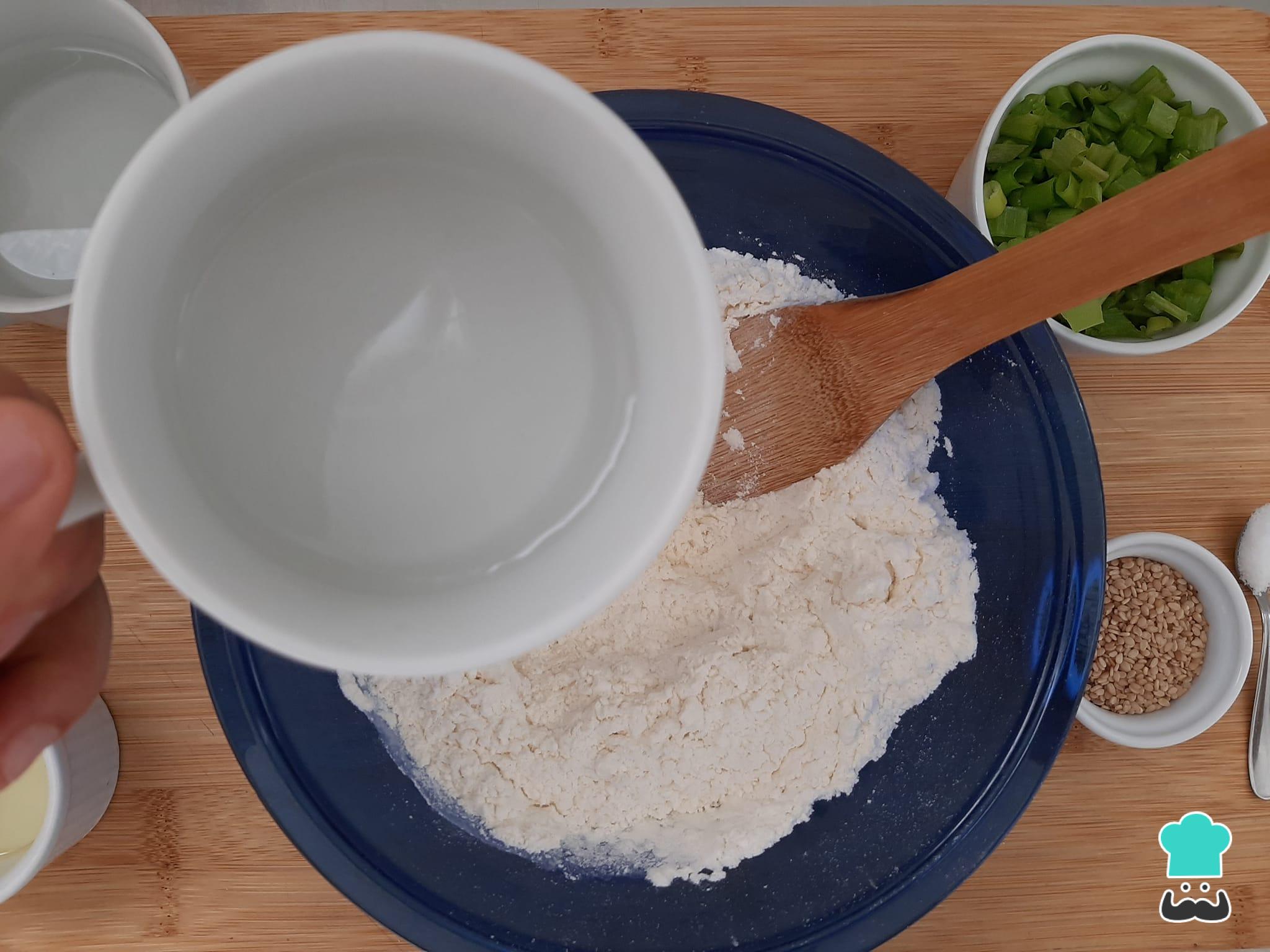 Em uma tigela com a farinha de trigo, adicione a água quente e misture.