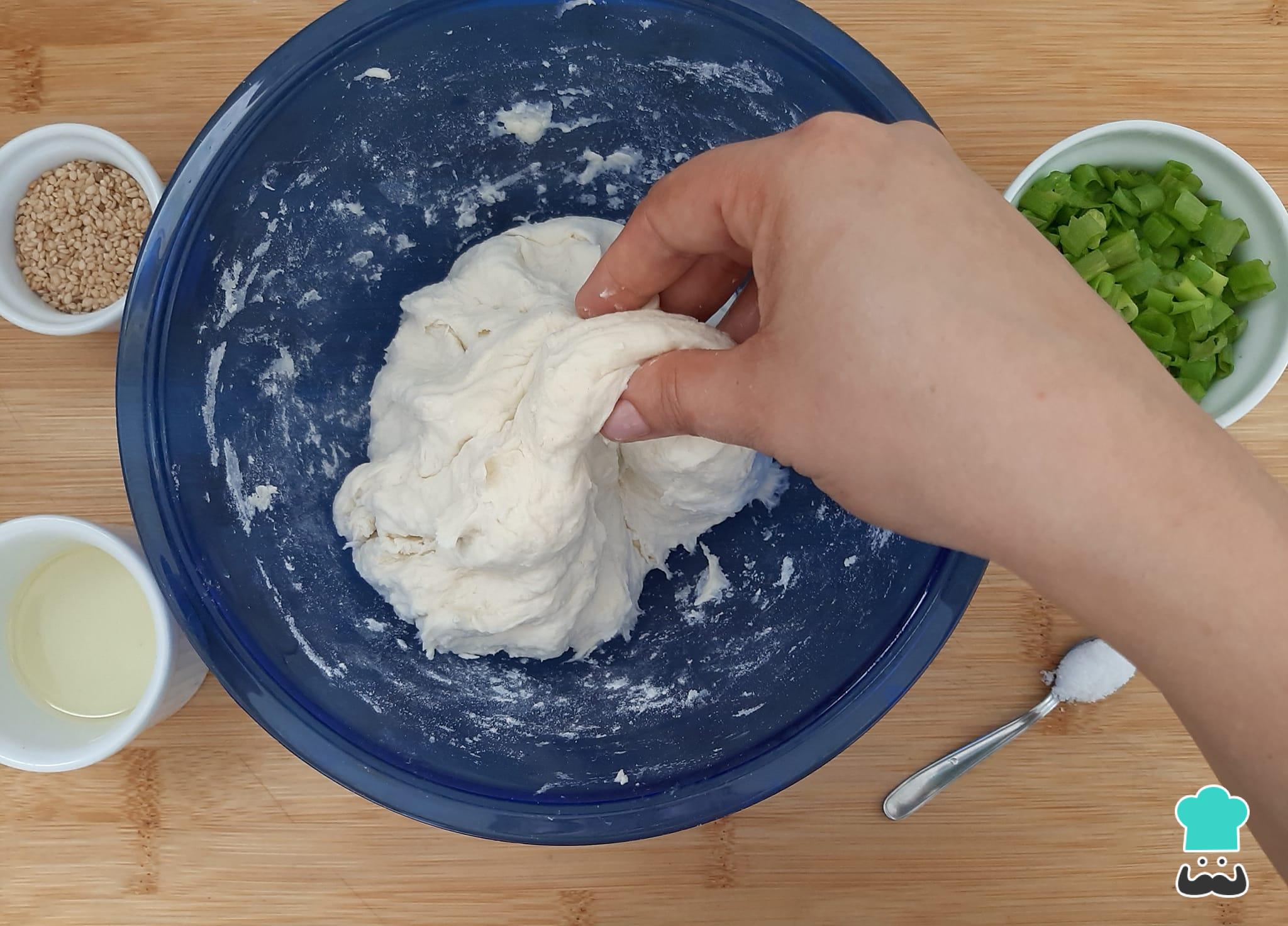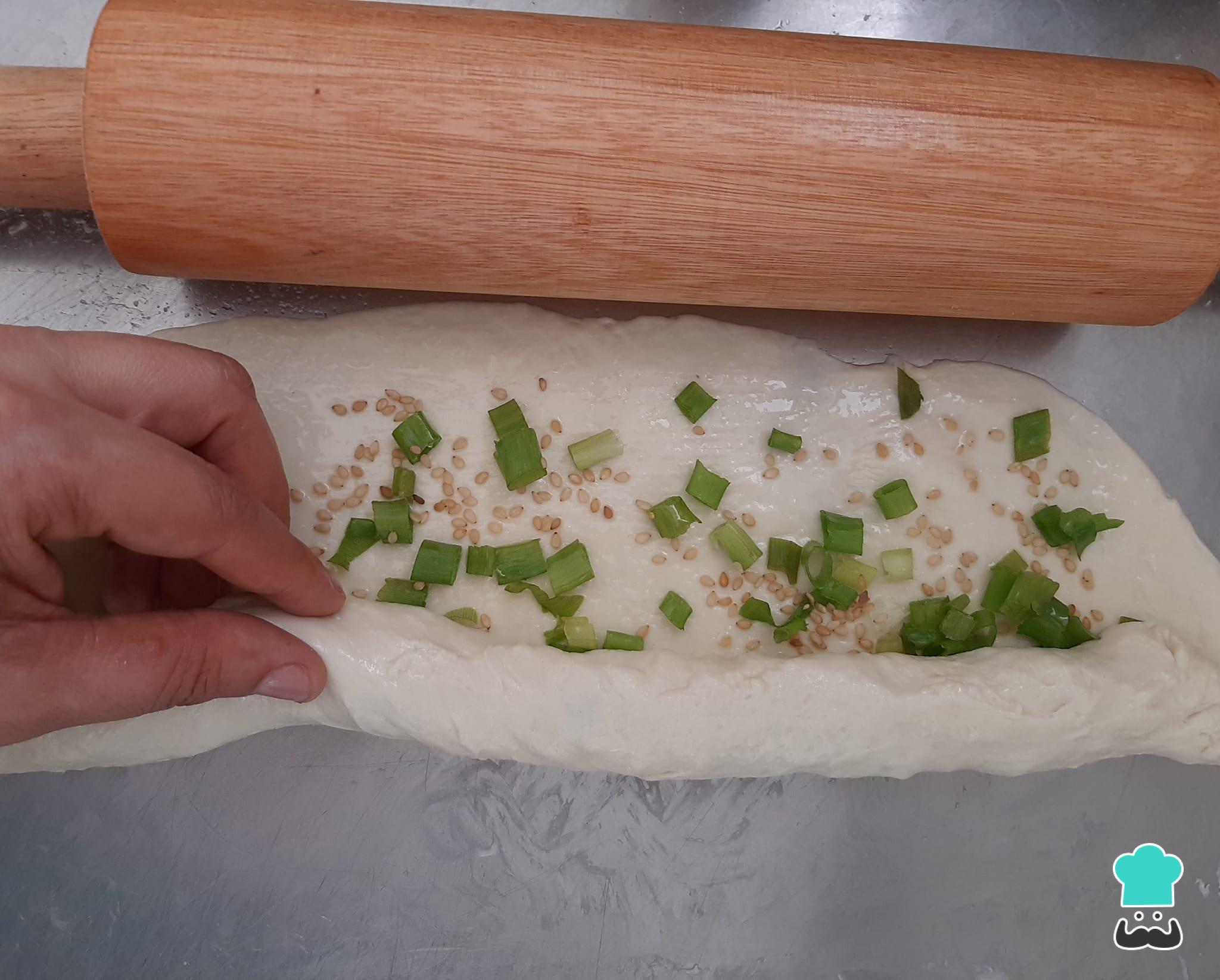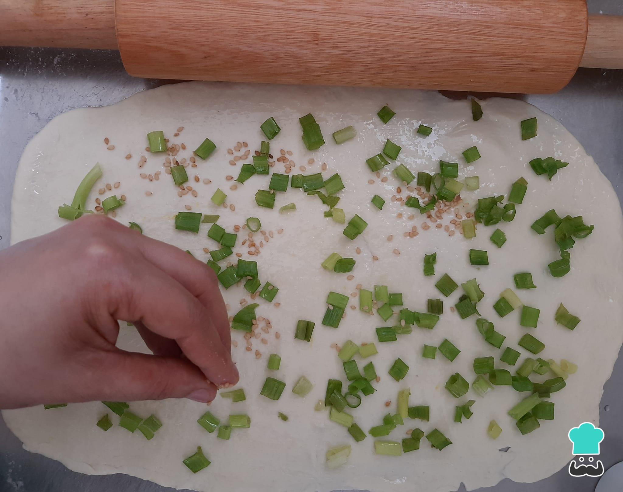 Espalhe metade da cebolinha picada e do gergelim sobre a massa.