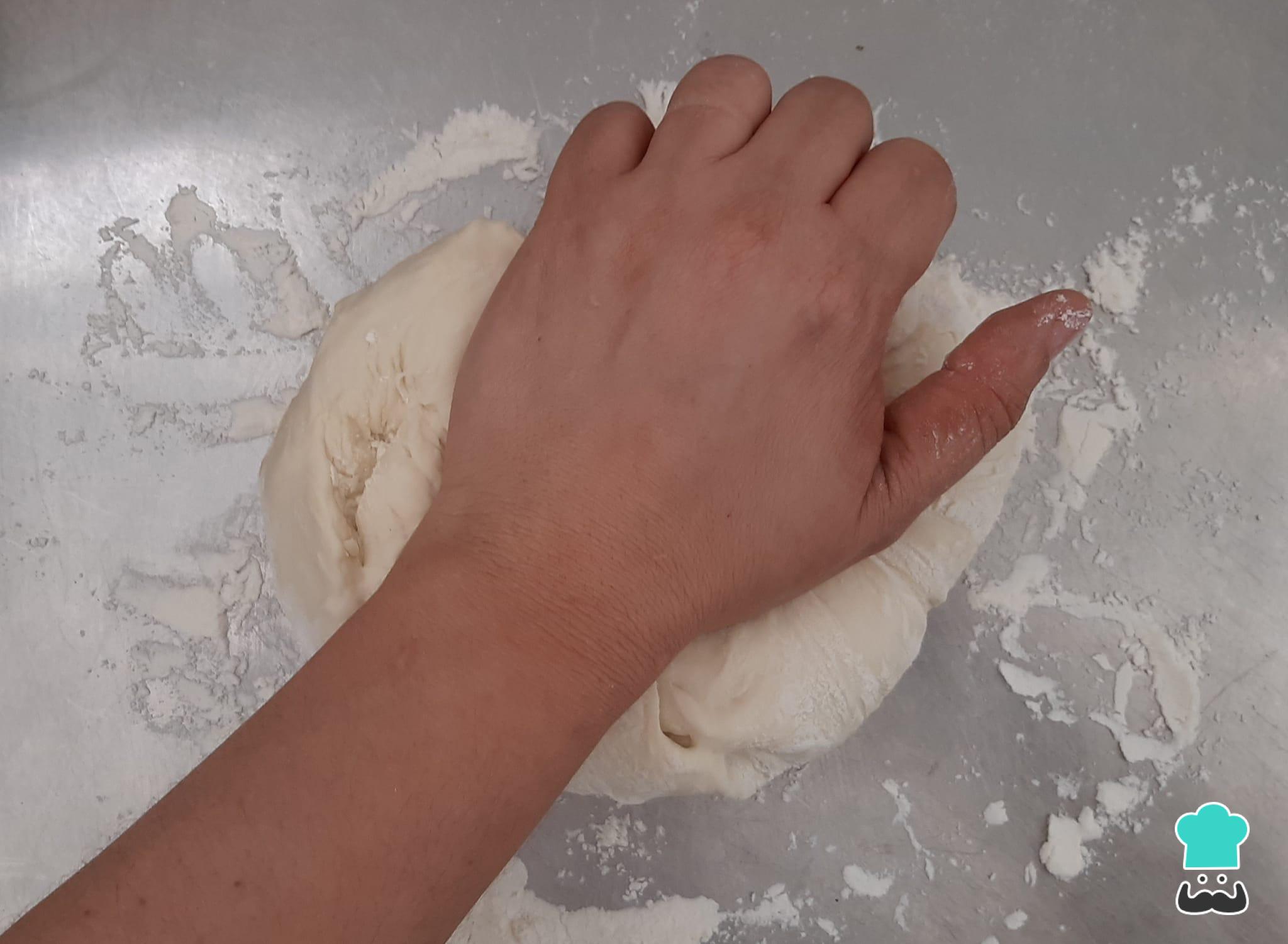 Sove um pouco a massa numa bancada enfarinhada, por cerca de 5 minutos só até ela ficar mais lisa.