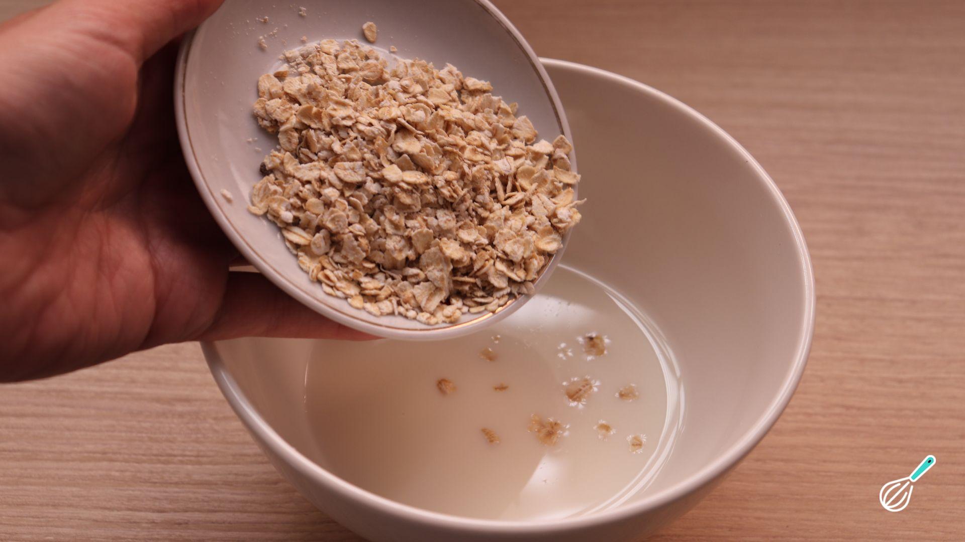 Misture o ovo, o leite, a farinha de aveia em uma tigela. Adicione o fermento e mexa mais uma vez até ficar homogêneo.