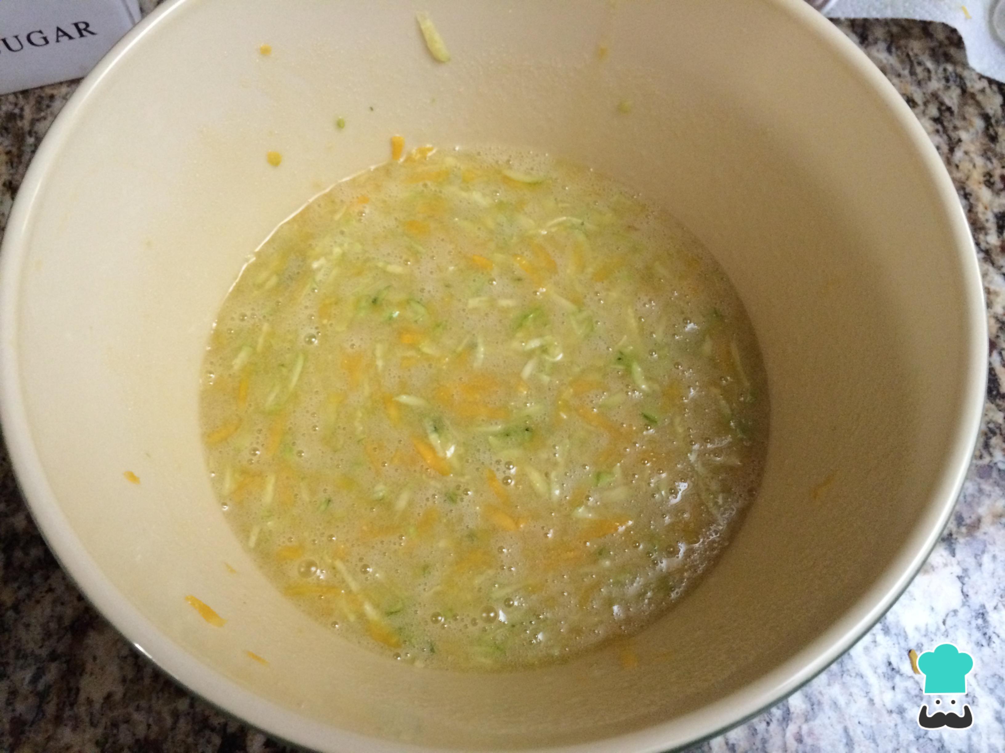 Para preparar a panqueca de abobrinha comece por misturar a maionese no ovo batido, acrescentar a abobrinha e a cebola e mexer.