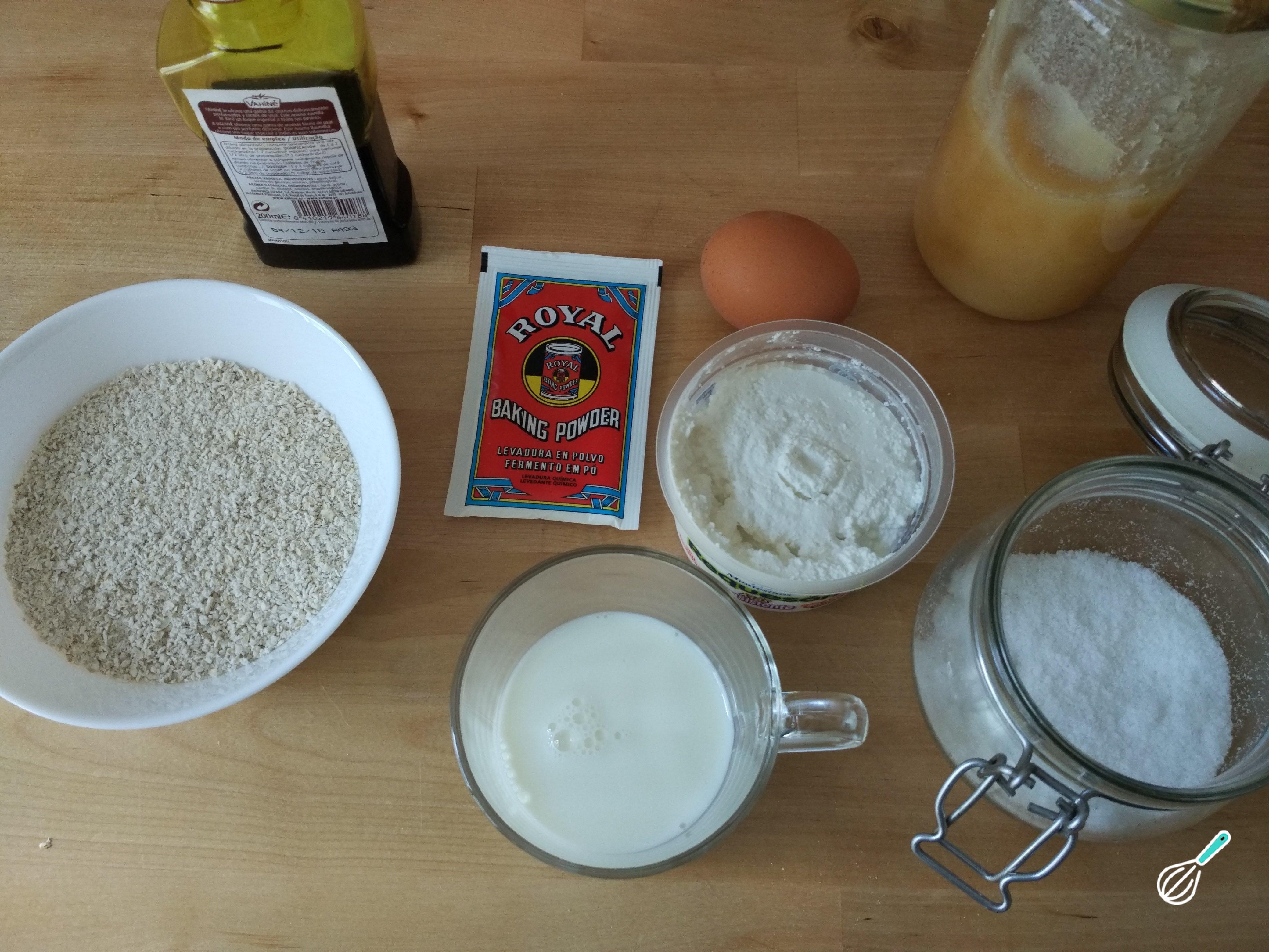 Primeiro reúna todos os ingredientes para preparar estas panquecas de aveia. As quantidades de ingredientes indicadas rendem cerca de 6 panquecas.