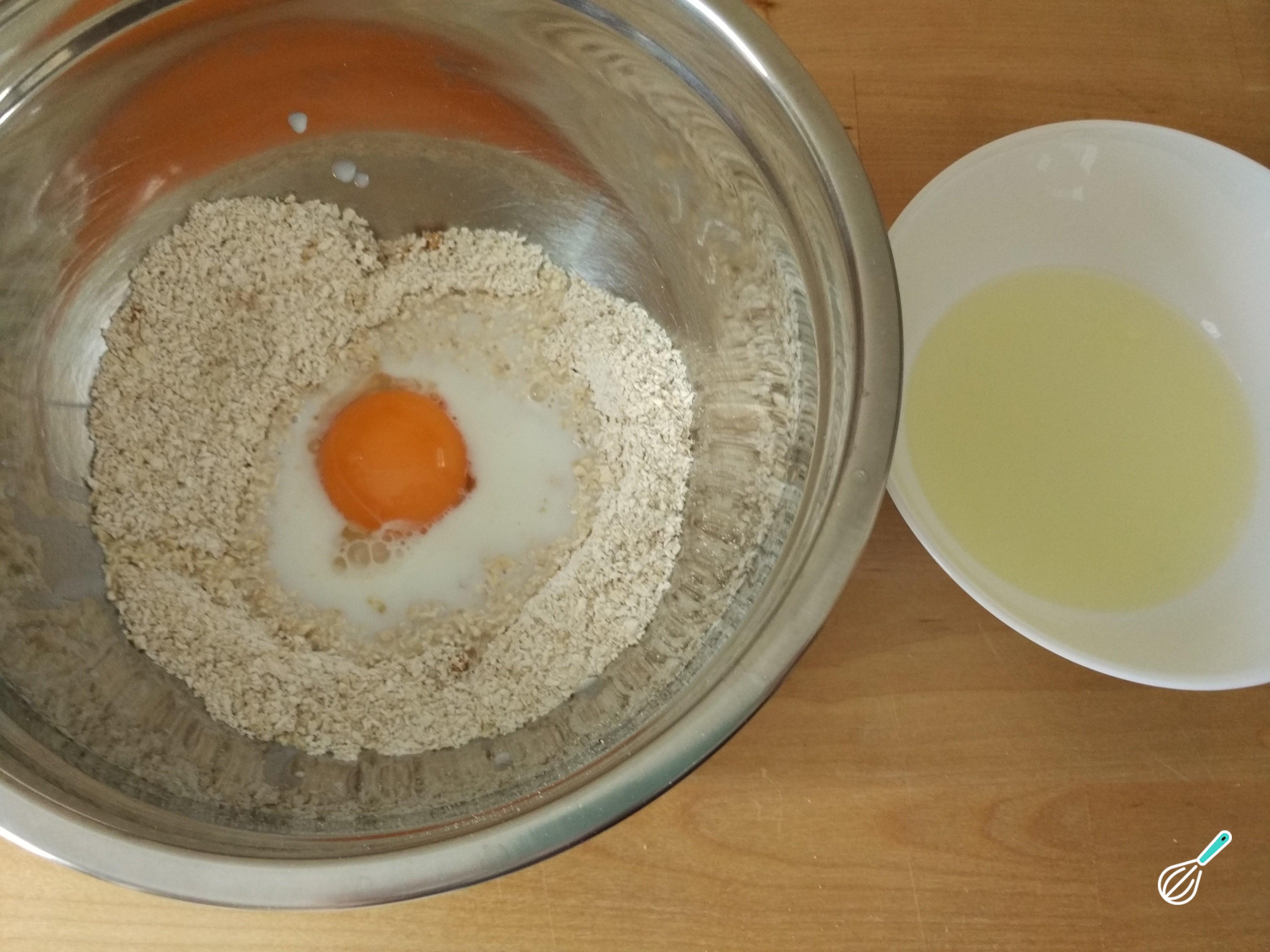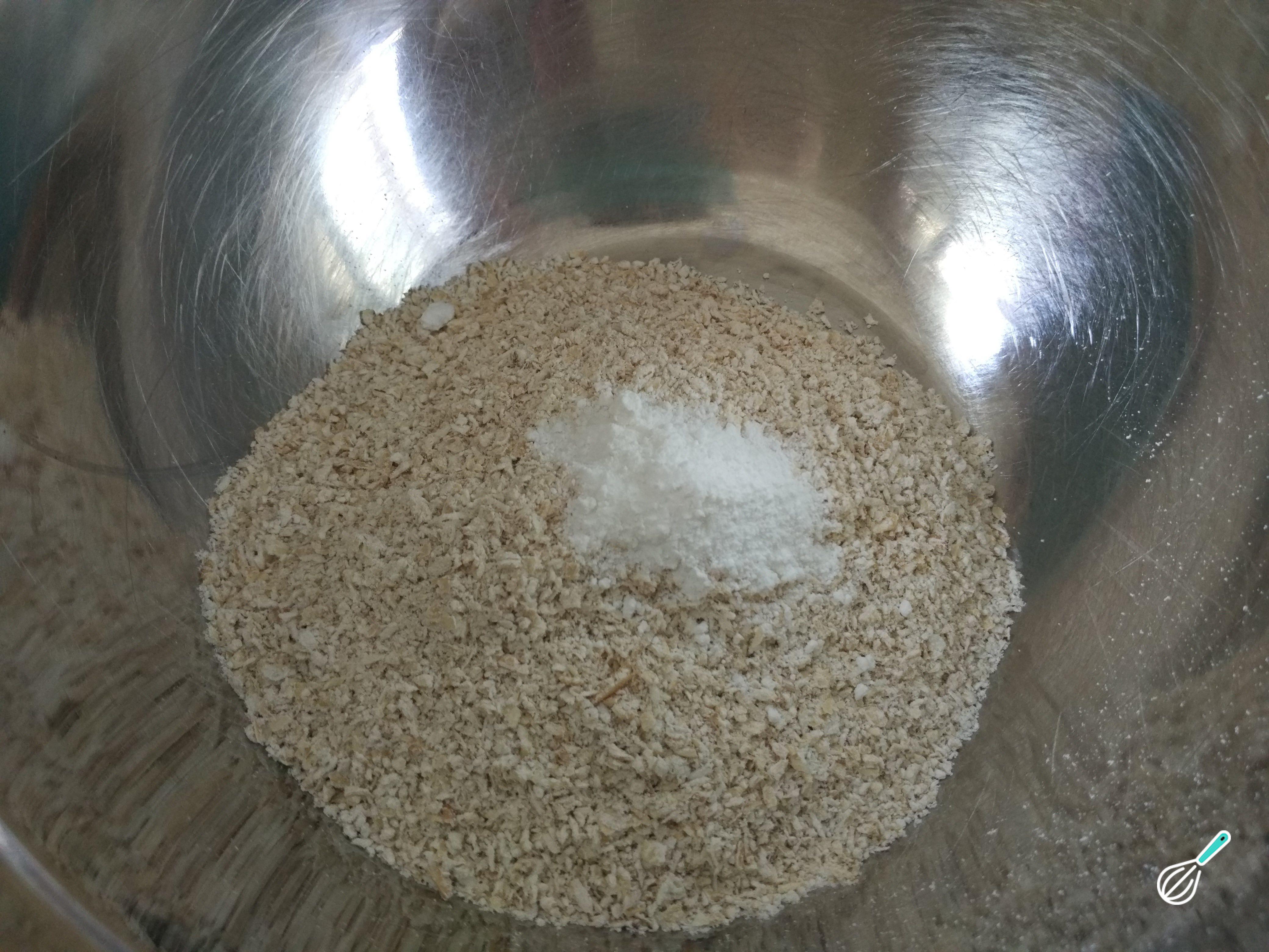 Em uma tigela misture a farinha de aveia com fermento em pó e o sal.