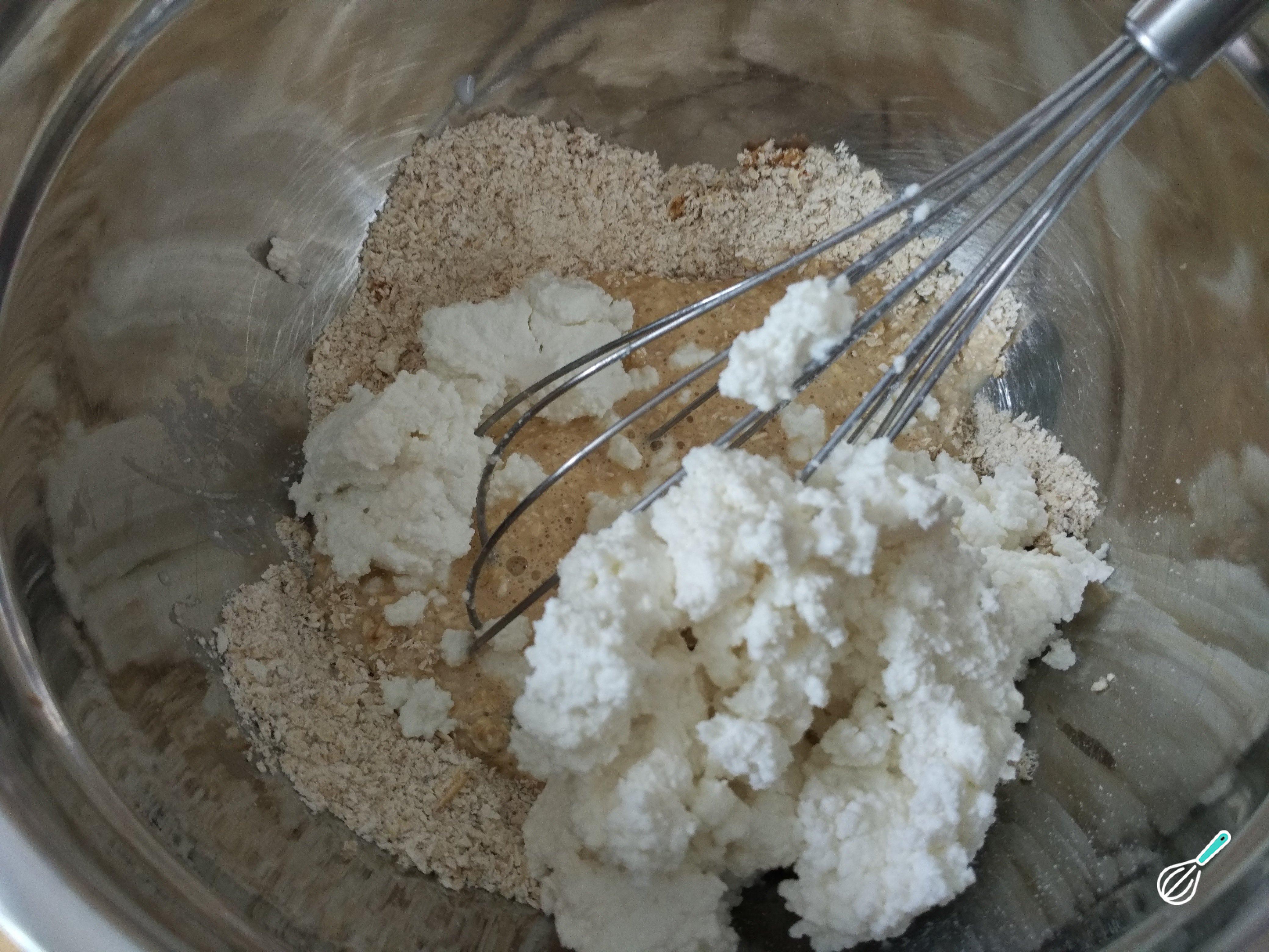 O passo seguinte desta receita de panqueca de aveia com queijo cottage é adicionar o queijo e envolver bem com os ingredientes na tigela.