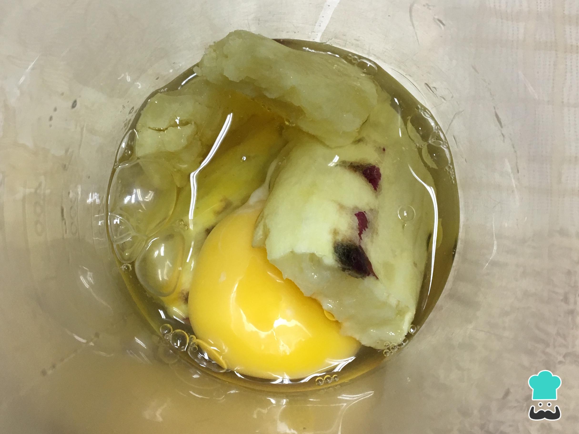 Para a massa da panqueca saudável bata no liquidificador os ovos com a batata doce e o adoçante.