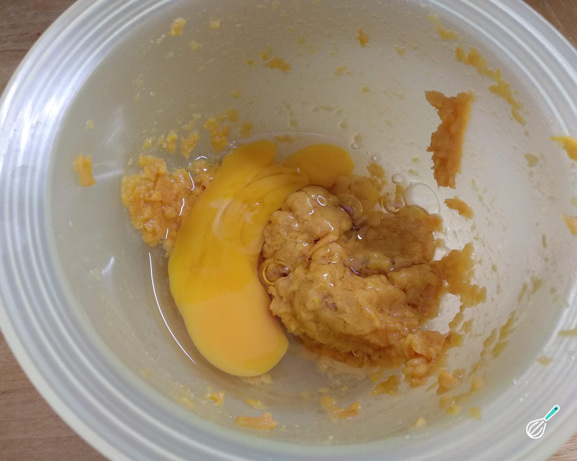 Comece por misturar o purê de batata doce com o ovo. Você pode fazer isso numa tigela, usando um garfo ou fouet, e também no liquidificador.