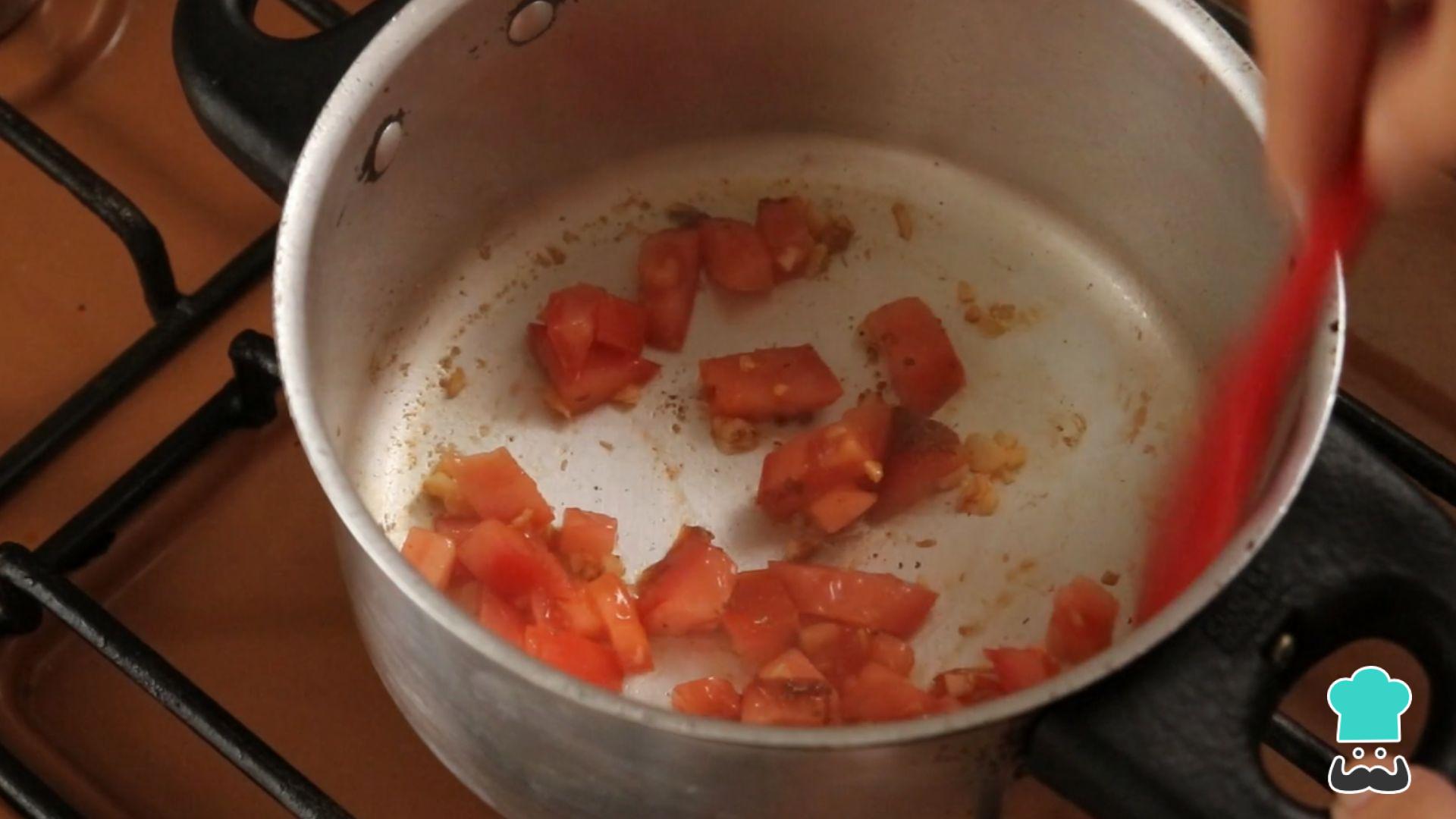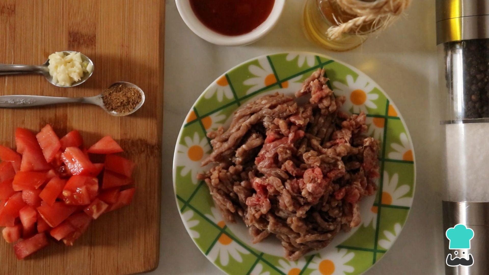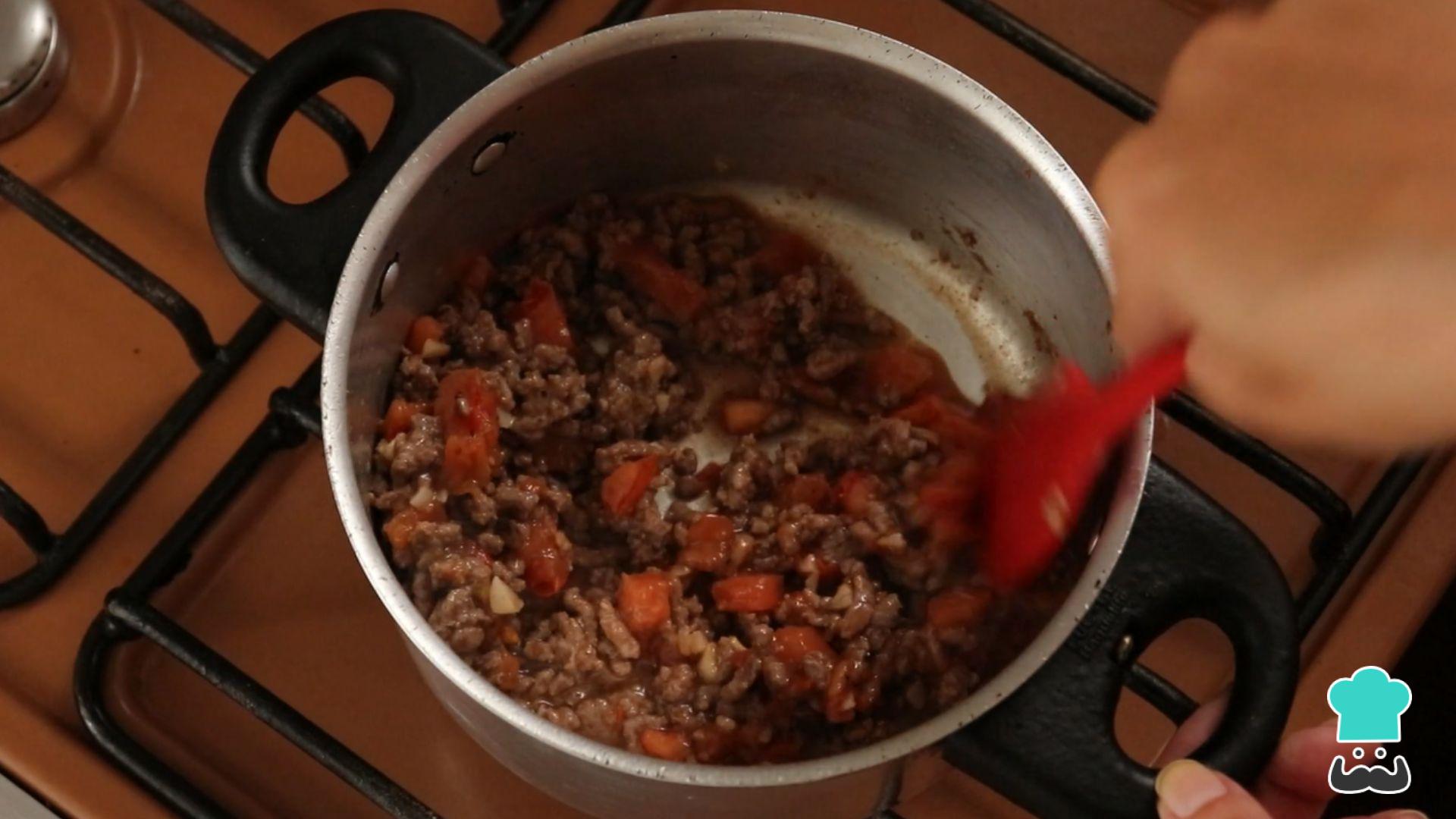 Vamos começar preparando o recheio de carne moída. Leve uma panela ao fogo médio, despeje o azeite e doure o alho. Em seguida acrescente o tomate picado e o cominho