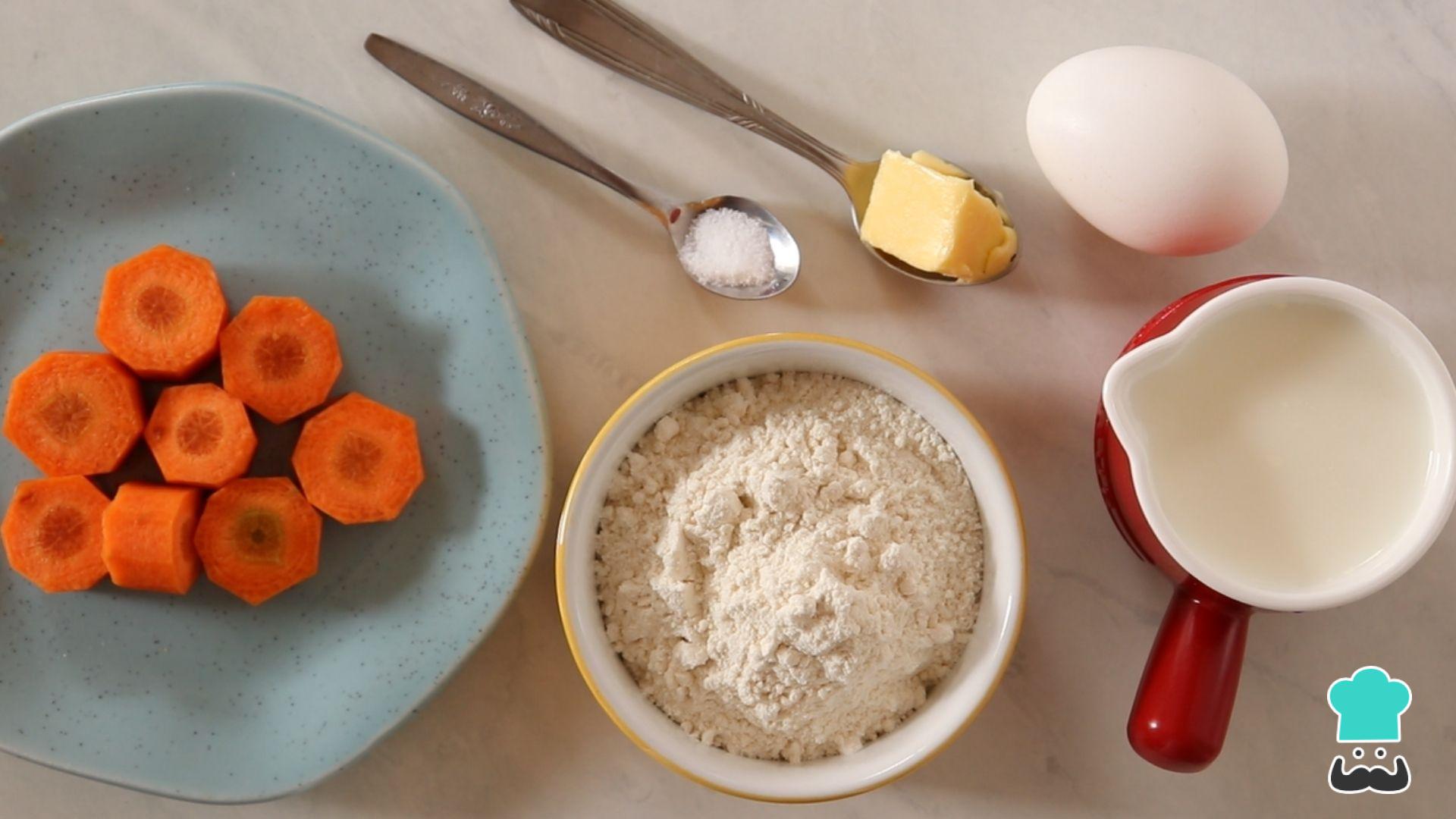 Comece separando os ingredientes da sua panqueca de cenoura fit. Os ovos, a manteiga e o leite devem estar em temperatura ambiente.