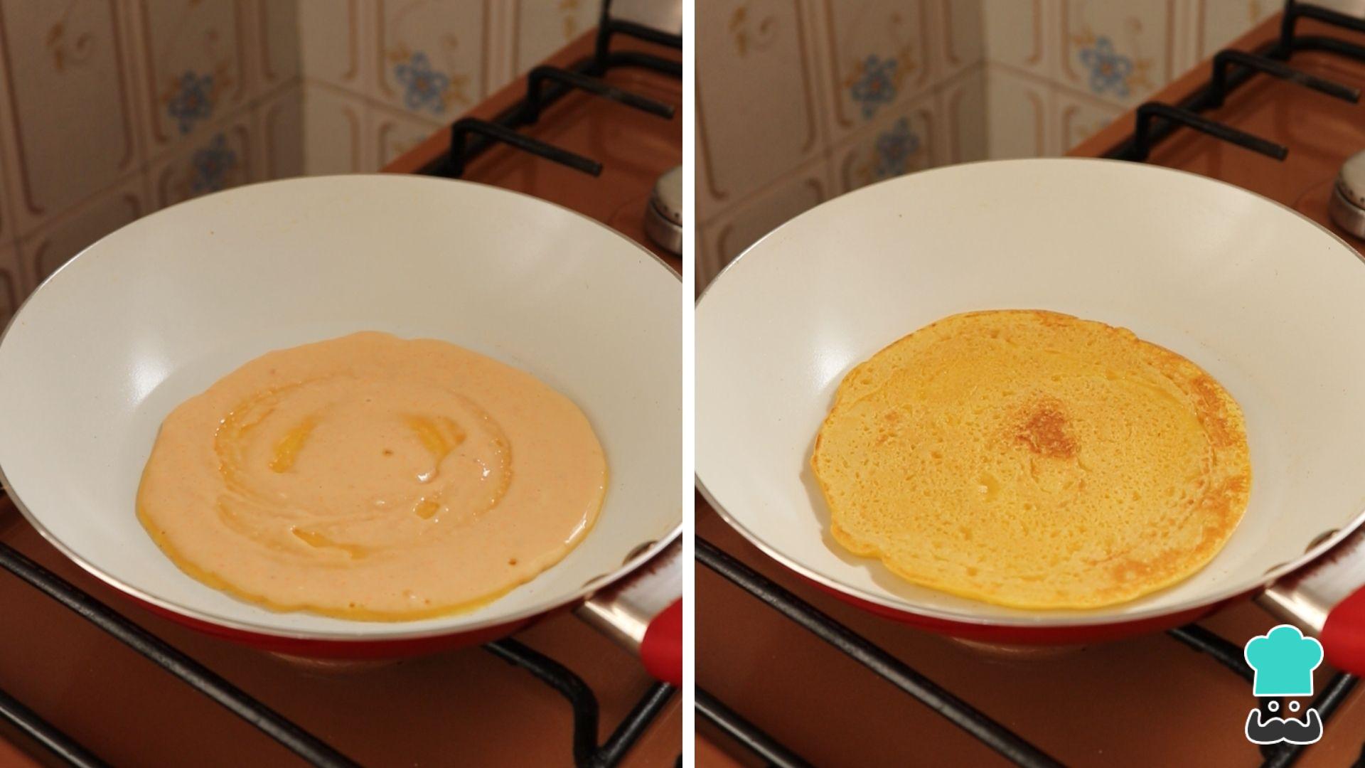 Espalhe uma porção da massa no fundo da panela, formando um círculo e, quando as laterais começarem a ficar sequinhas, é hora de virar a sua panqueca para dourar do outro lado.