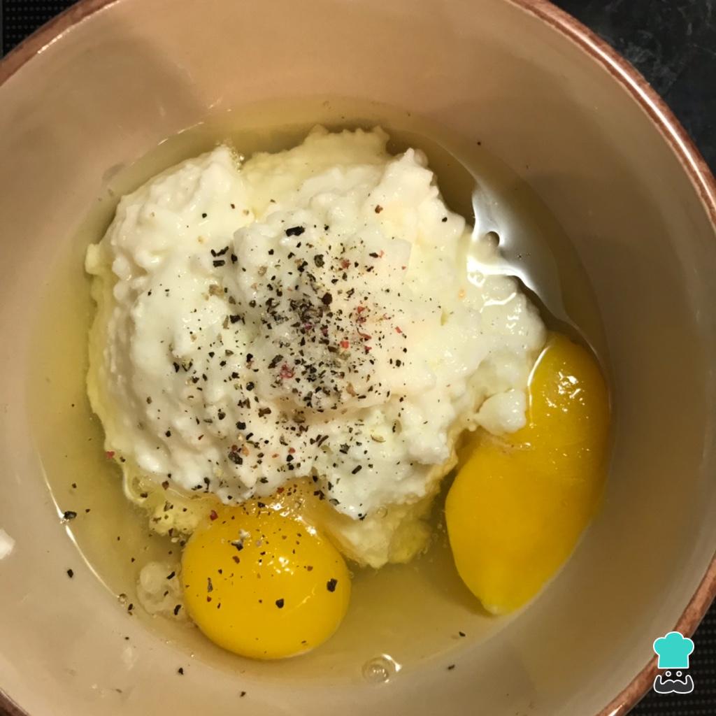 Comece suas panquequinhas misturando os ovos com o queijo cottage e temperando com sal e pimenta.