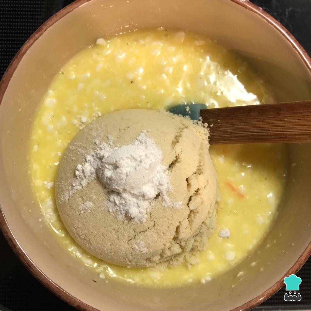 Junte a fécula de batata, a farinha de amêndoas e o fermento em pó químico. Mexa bem.