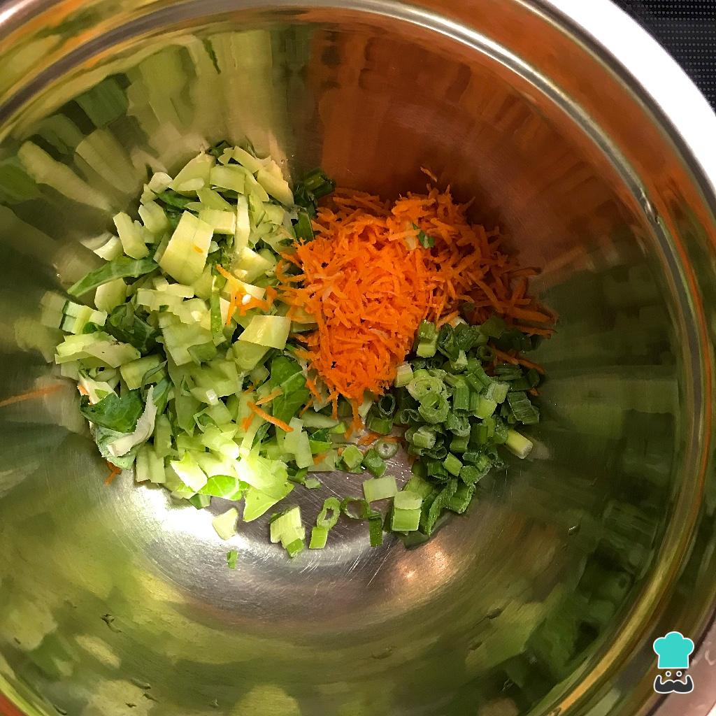 Numa vasilha misture os legumes: os talos e folhas de couve flor com a cebolinha e a cenoura.