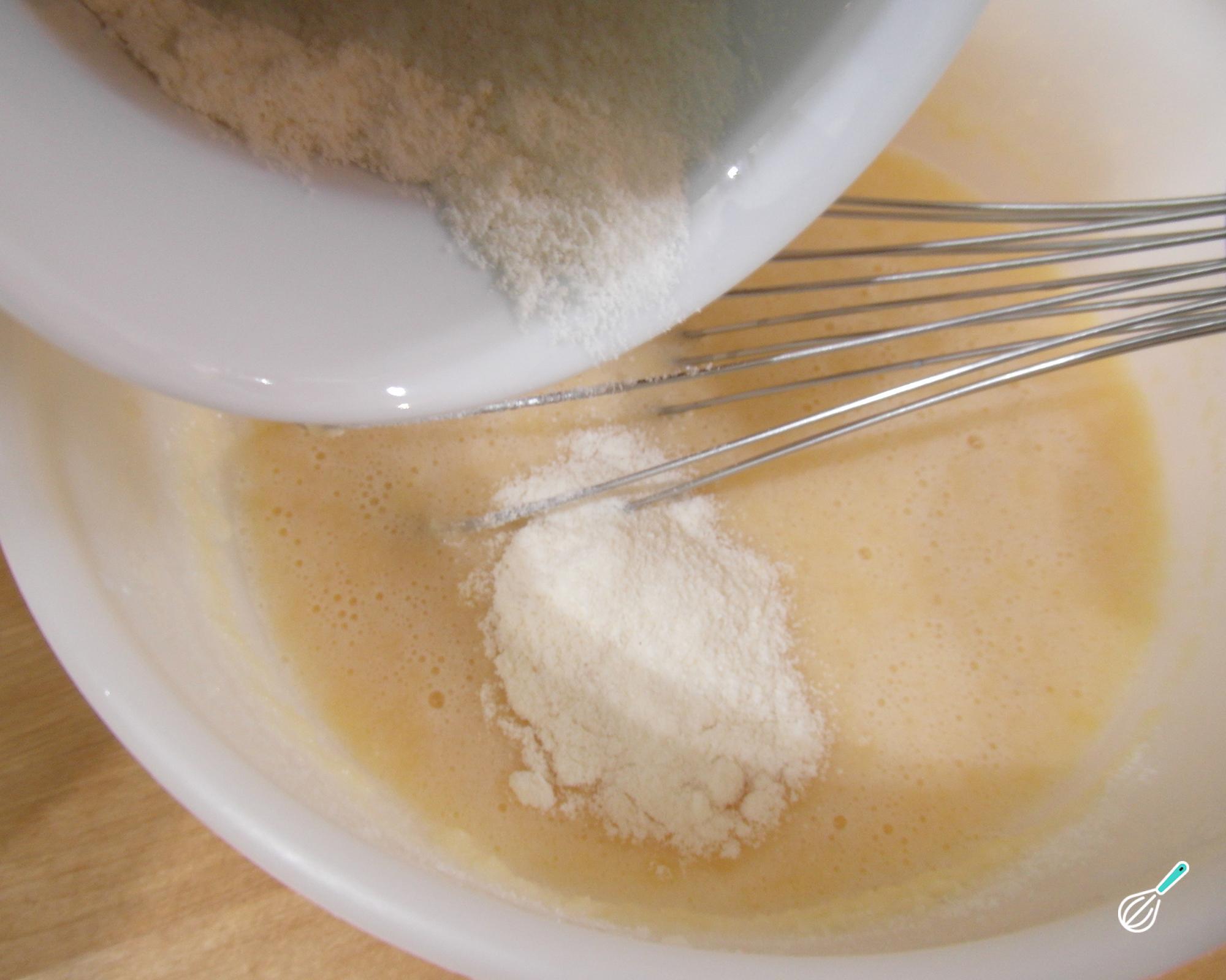 Junte o leite e a farinha de coco e misture muito bem. Se preferir pode substituir o leite de coco por leite desnatado ou uma bebida vegetal à sua escolha (bebida de soja, de amêndoa, etc).