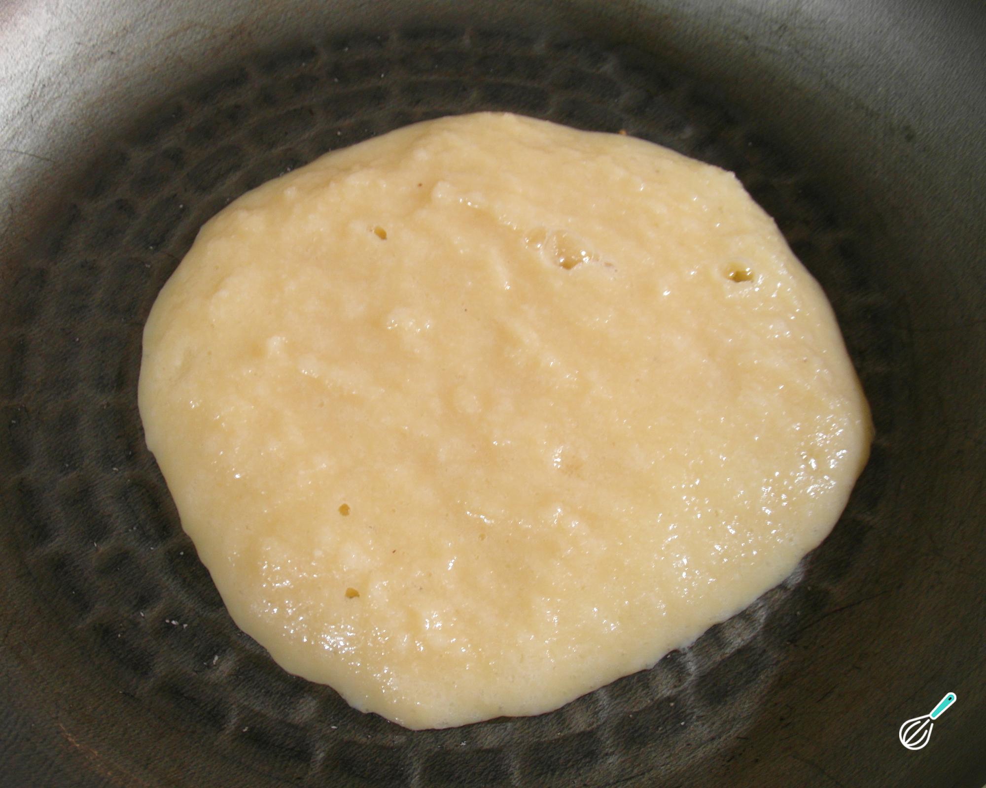 Dica: Vire cuidadosamente e rapidamente, já que estas panquecas não ficam muito consistentes e a massa pode acabar escorrendo.