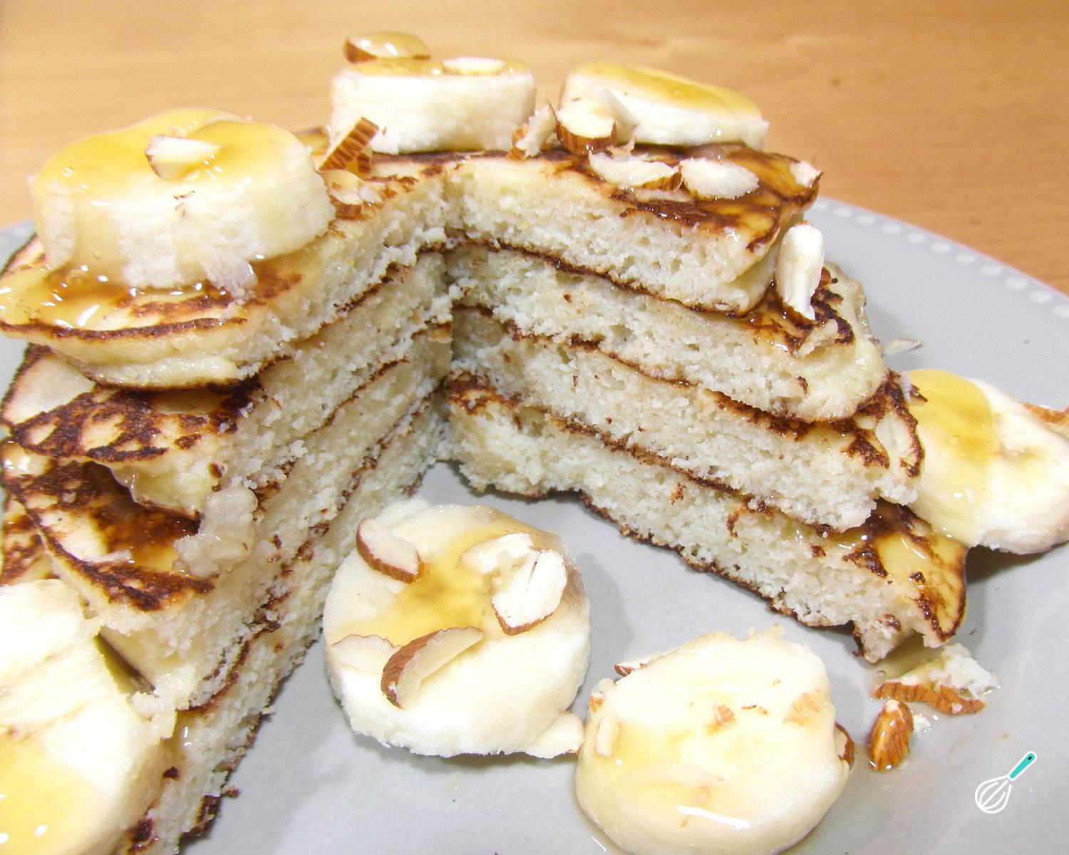 Coloque as panquecas de farinha de coco umas sobre as outras, espalhando um pouco de mel, xarope de bordo ou geleia de arroz entre elas. Decore com fatias de banana e amêndoa picada e delicie-se com esta receita saudável e muito gostosa!