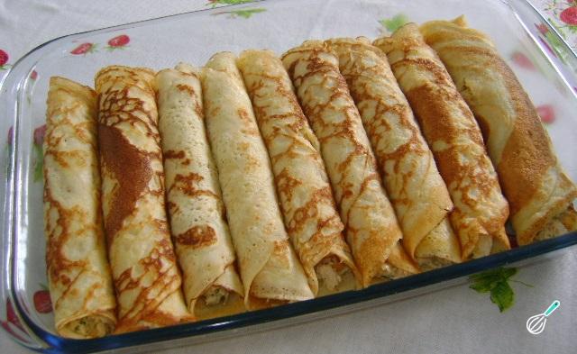Comece agora a montagem das panquecas de frango, pegando numa e colocando no centro uma porção do recheio; enrole e coloque em um refratário. Repita até esgotar as panquecas e o recheio.