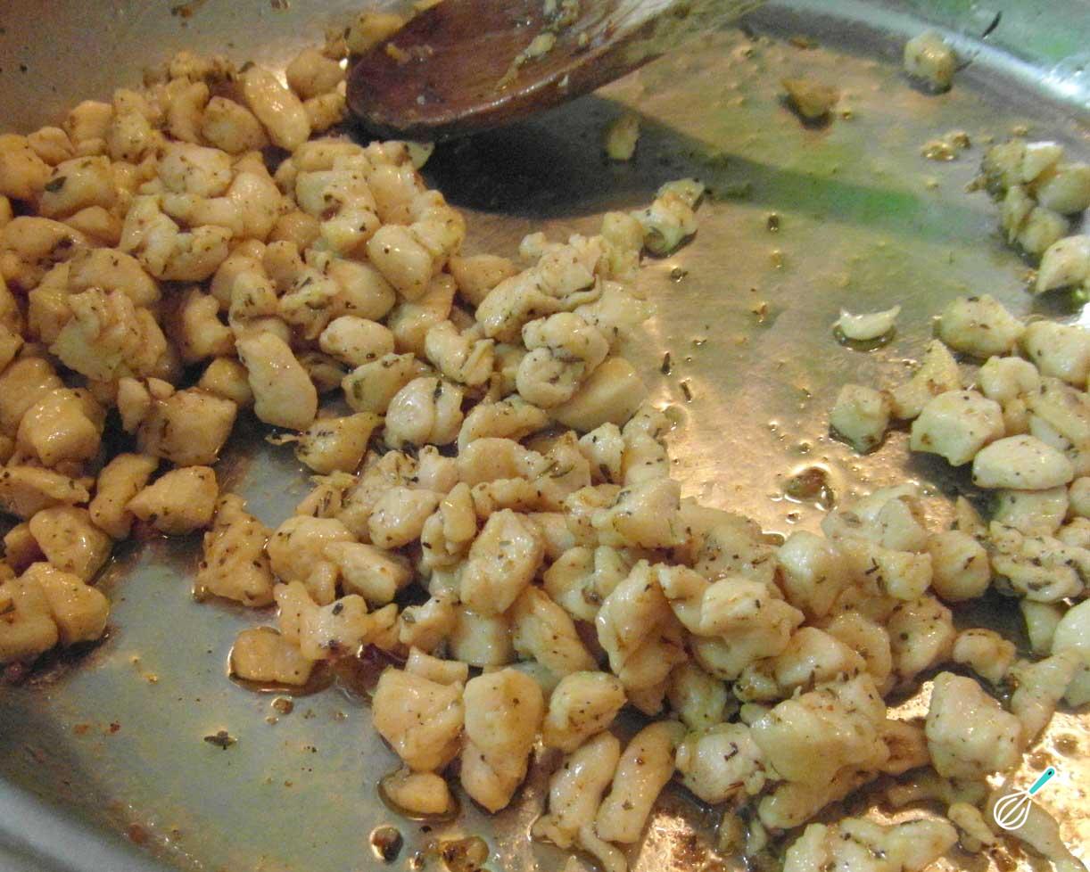 Quando a cebola estiver macia, acrescente o frango e tempere com tomilho, curry, pimenta do reino e sal a gosto. Cozinhe por cerca de 10 minutos, ou até a carne ficar pronta, e retire para um prato.