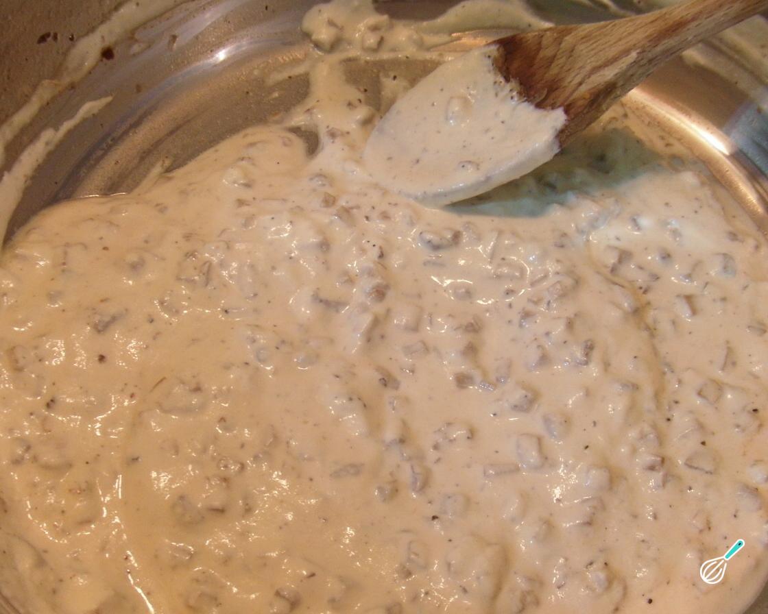 Quando o molho engrossar adicione o champignon e tempere a gosto com sal e pimenta. Misture e desligue o fogo.