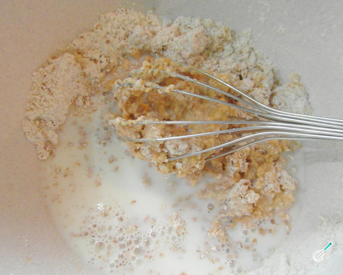 Por último, prepare a massa das panquecas salgadas: misture em uma tigela a farinha, o sal e o fermento. Acrescente os ovos batidos, mexa e adicione o leite pouco a pouco, enquanto mistura com um fouet, até obter um creme mais líquido que espesso.