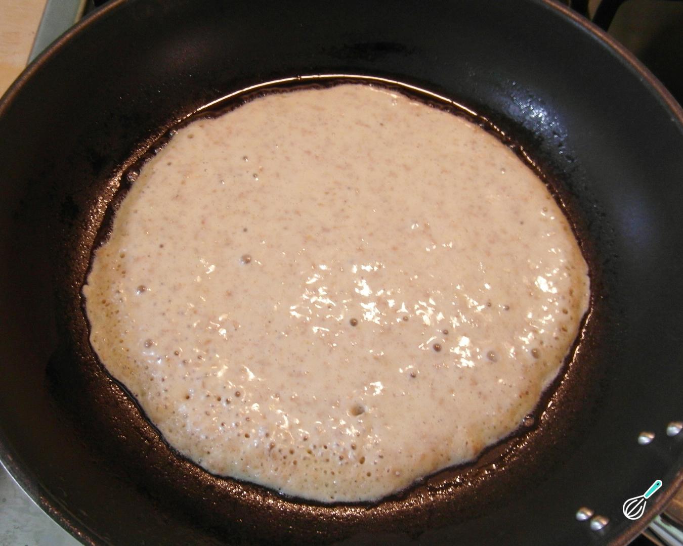 Para cozinhar as panquecas leve ao fogo médio uma frigideira com um pouco de óleo. Quando estiver quente coloque uma porção da massa de panqueca e rapidamente espalhe - o ideal é que a panqueca fique bem fina, mas não transparente. Quando começar borbulhando ao centro vire ao contrário e cozinhe por mais uns segundinhos antes de tirar.