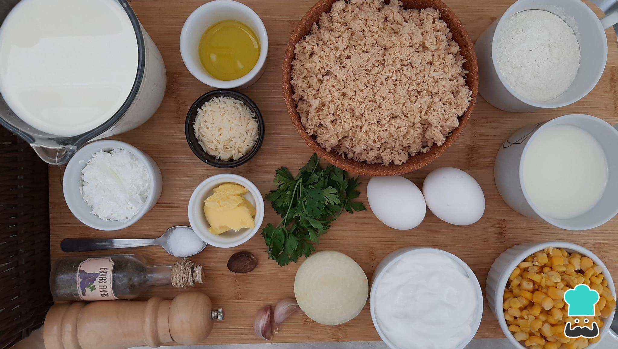 Separe todos os ingredientes necessários para preparar esta receita de panqueca de frango simples com molho branco.