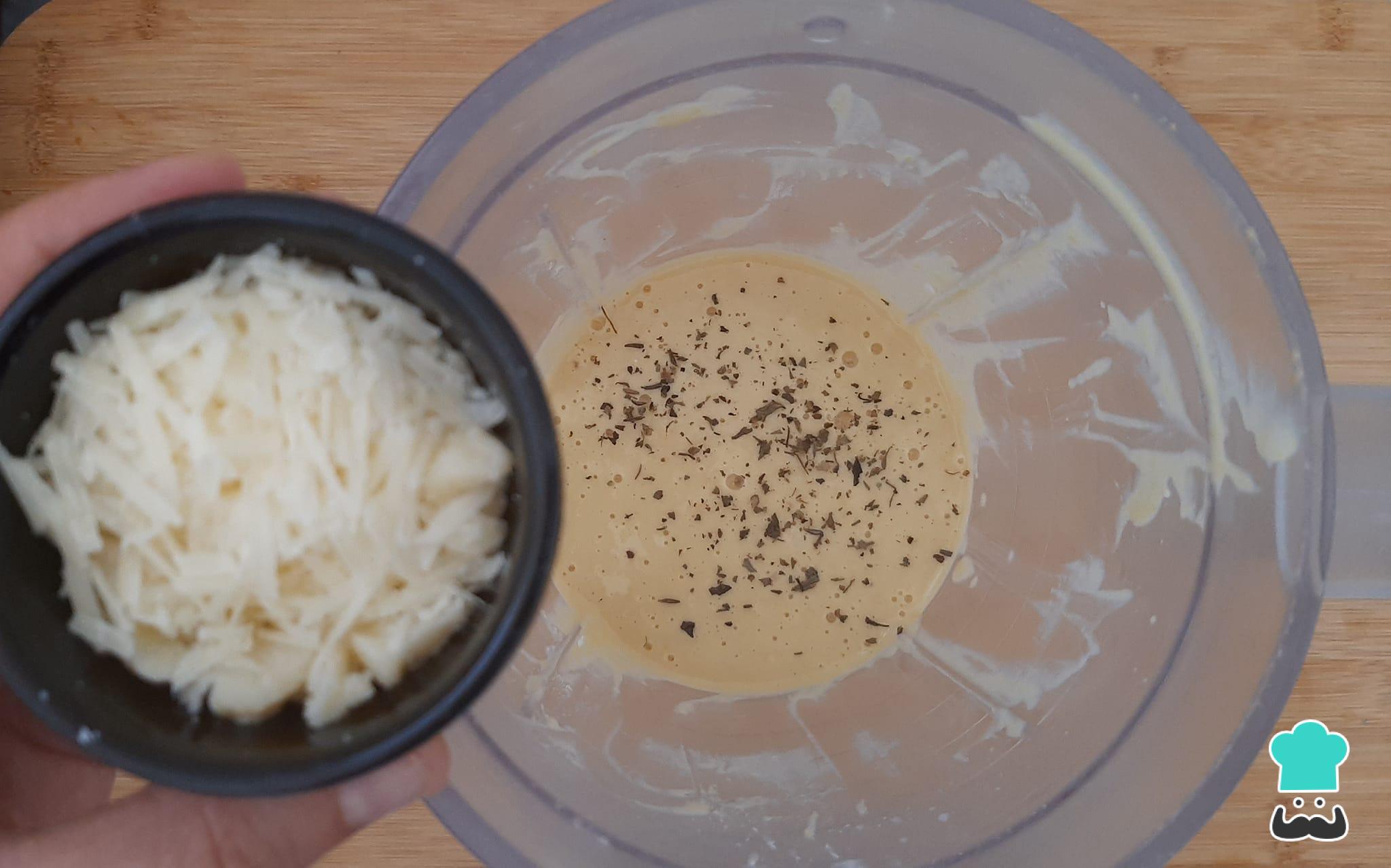 Por último, acrescente o queijo parmesão ralado e as ervas finas e misture ligeiramente.