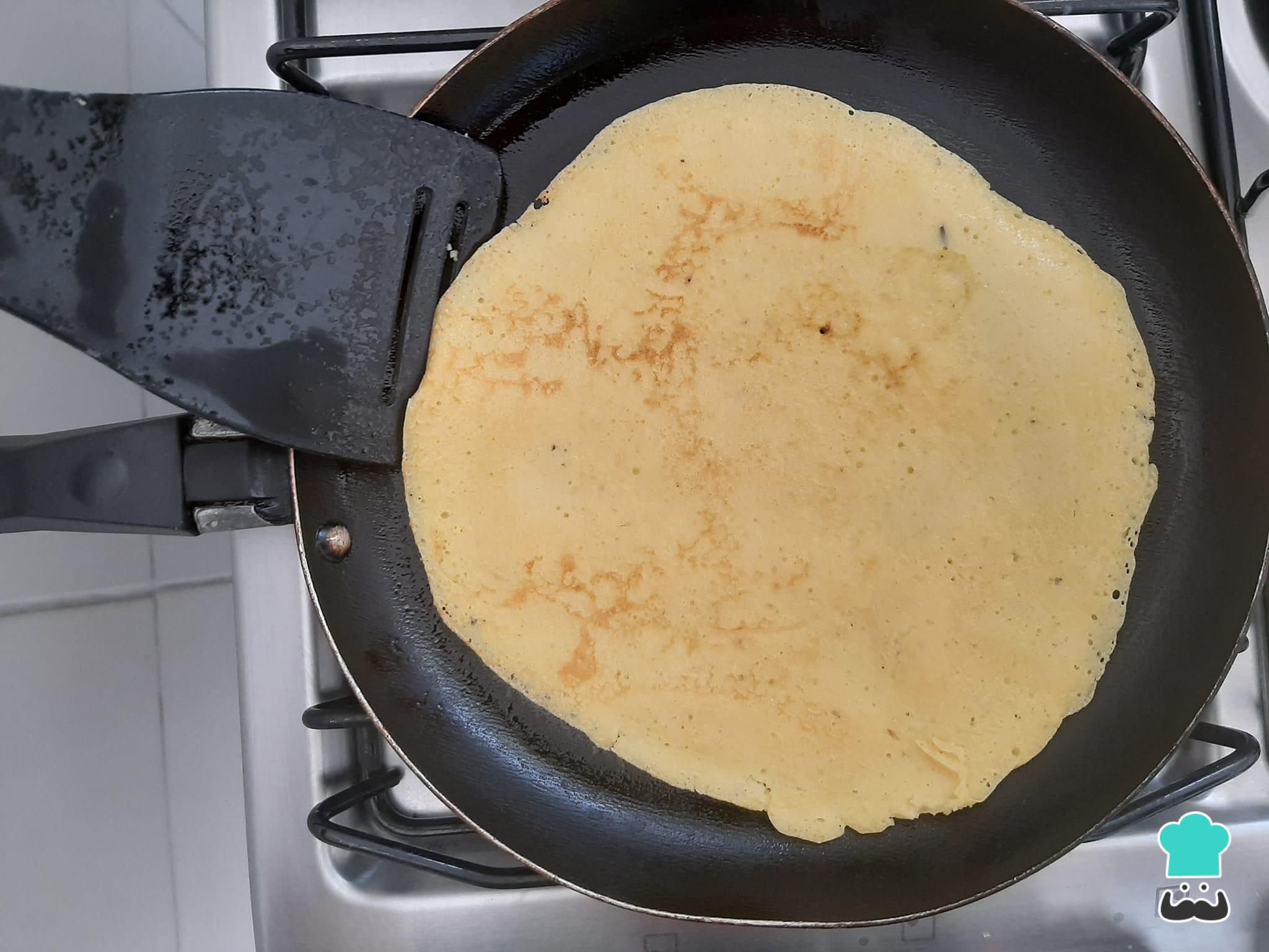 Numa frigideira, pincelada com azeite de oliva, adicione uma concha média de massa e refogue em fogo baixo até que as bordas se soltem com facilidade. Vire o lado da panqueca e deixe refogar até dourar levemente.