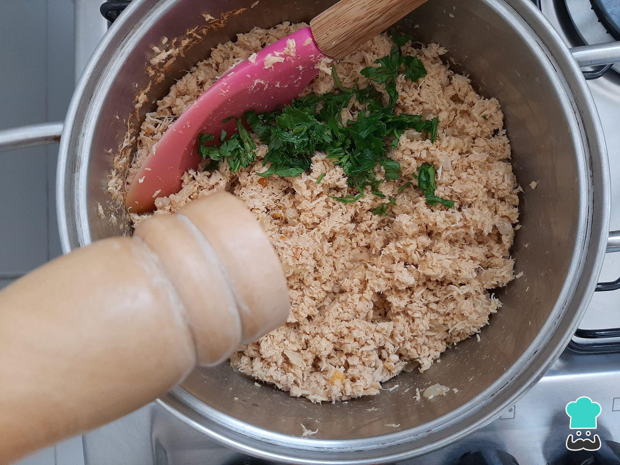 Junte a salsinha picada e tempere com sal e pimenta do reino, misturando bem.
