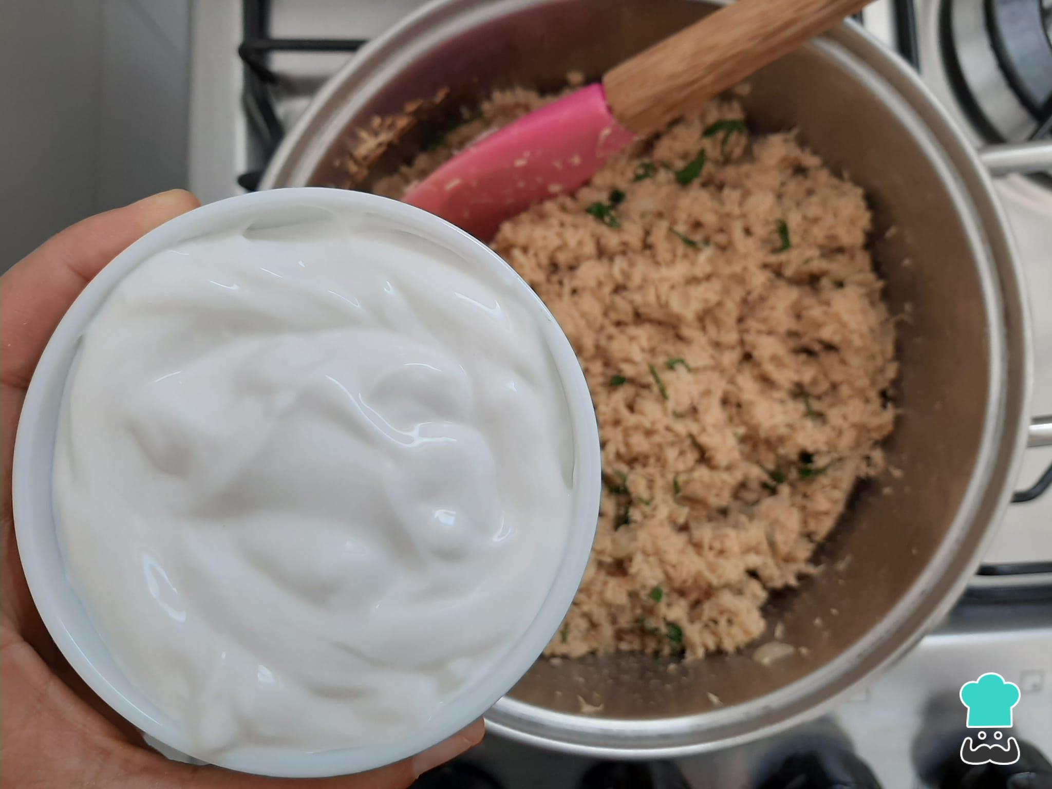 Para preparar o recheio de frango, numa panela média, aqueça o azeite de oliva e refogue a cebola e o alho até dourarem levemente. Adicione o frango cozido e desfiado e deixe refogar por mais 3 minutos.