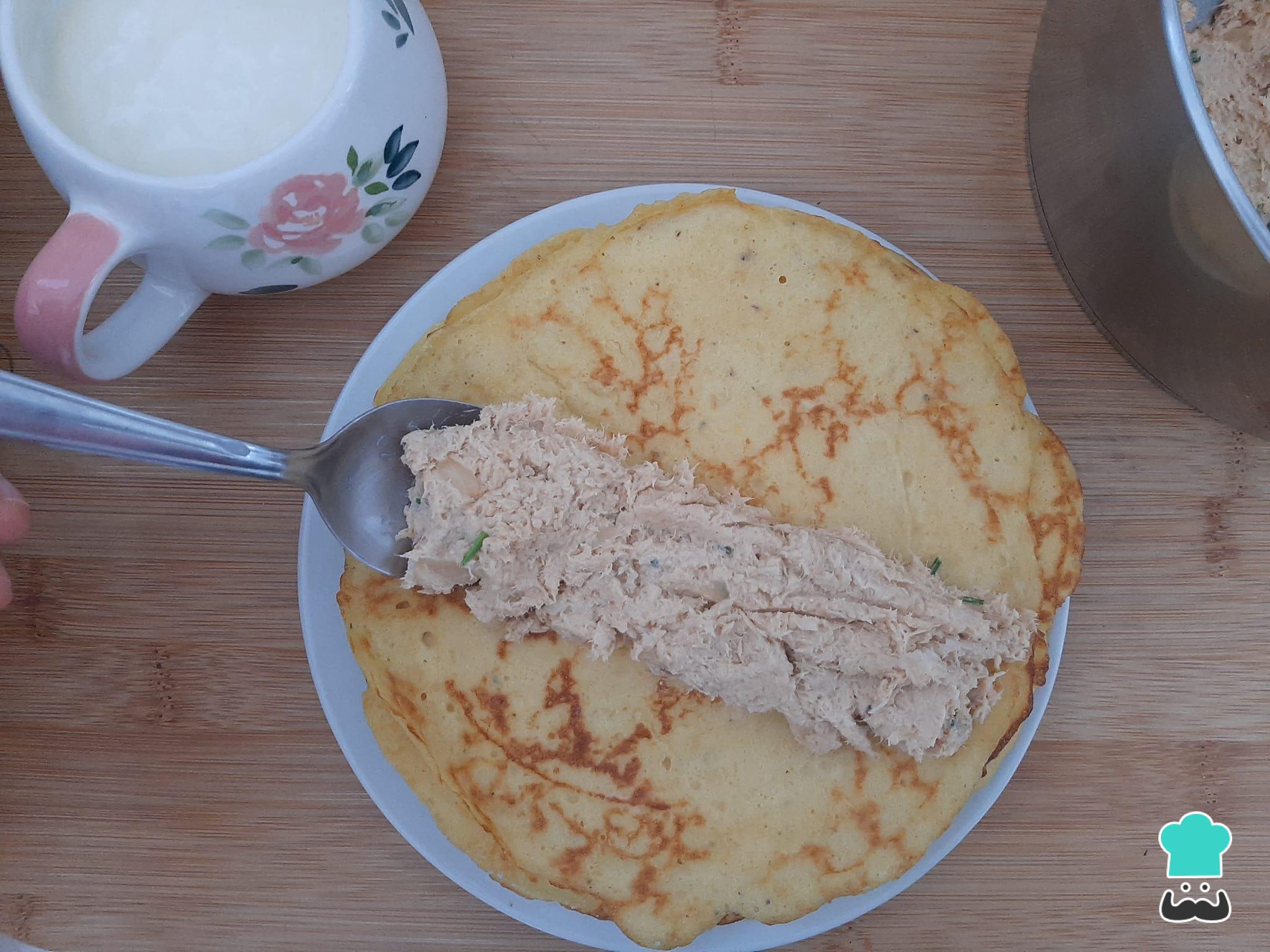 Para montar as panquecas, coloque o recheio de frango no centro do círculo, como mostra a foto.
