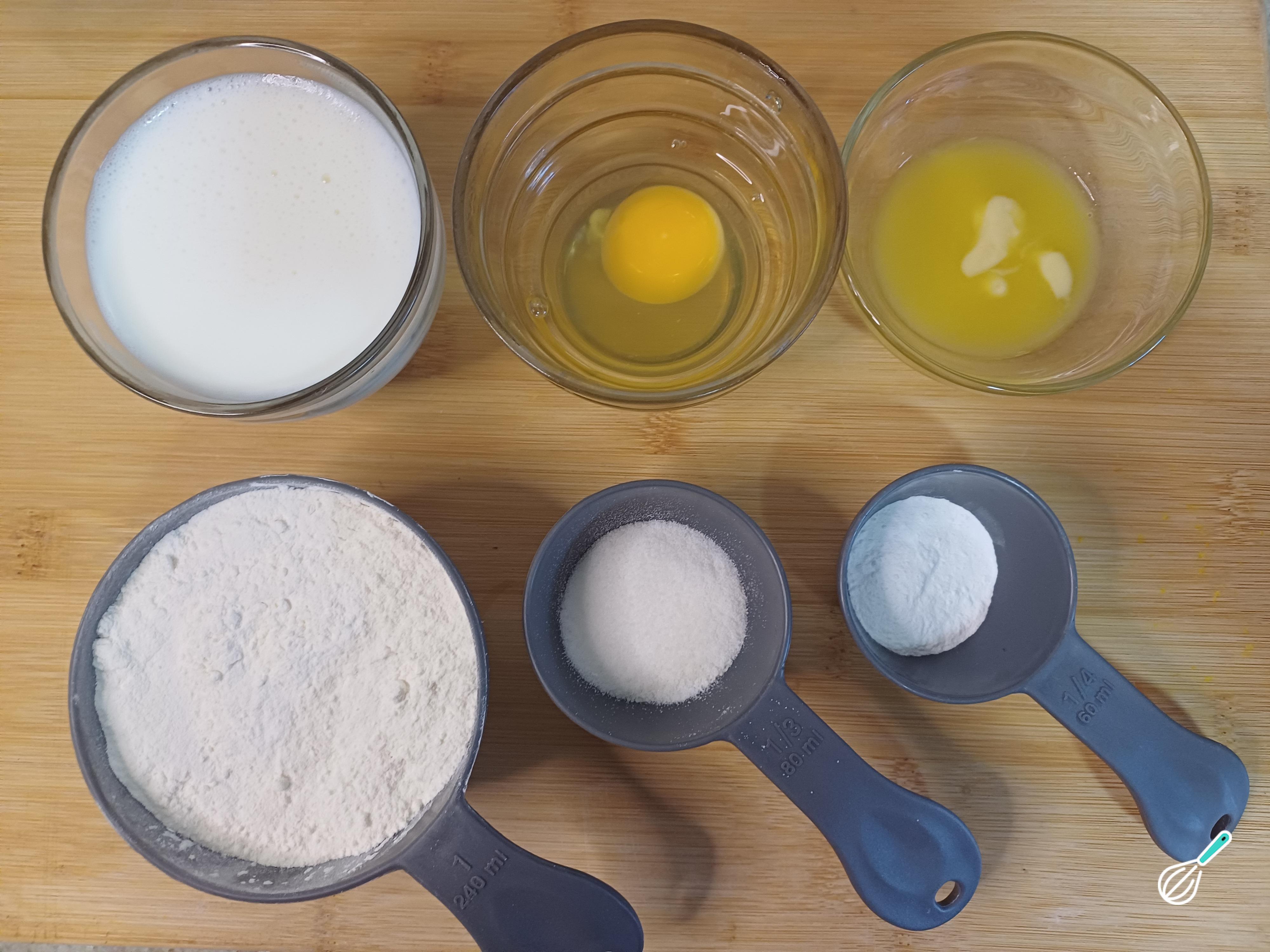 Antes de começar, separe todos os ingredientes. Certifique-se que a manteiga esteja derretida e deixe o leite em temperatura ambiente para facilitar a mistura. Isso ajudará a manter a consistência da massa homogênea e evitará que a manteiga derreta de forma desigual ao entrar em contato com ingredientes frios.