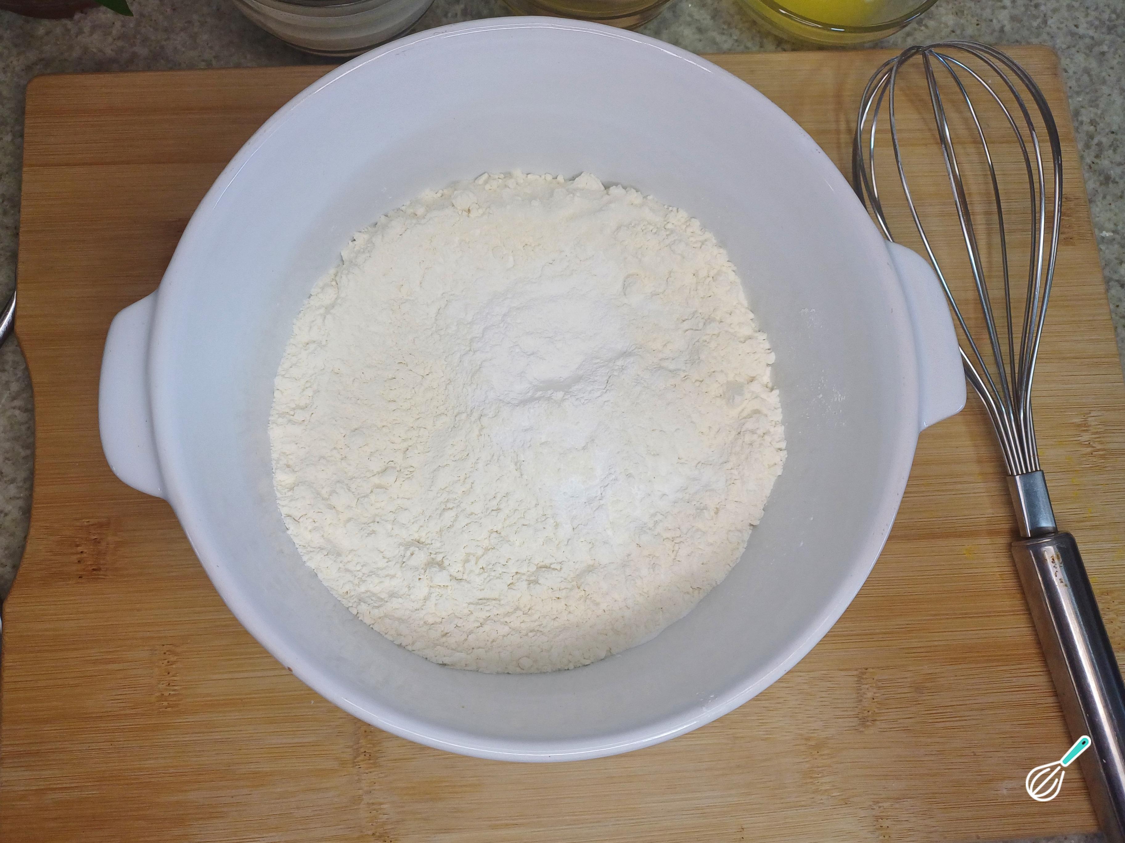 Em uma tigela grande, peneire a farinha de trigo, adicione o açucar e o fermento em pó. Misture os ingredientes secos até que estejam bem incorporados.