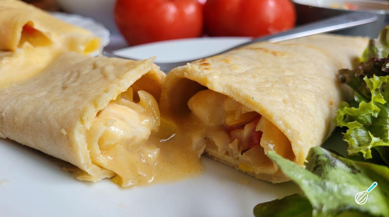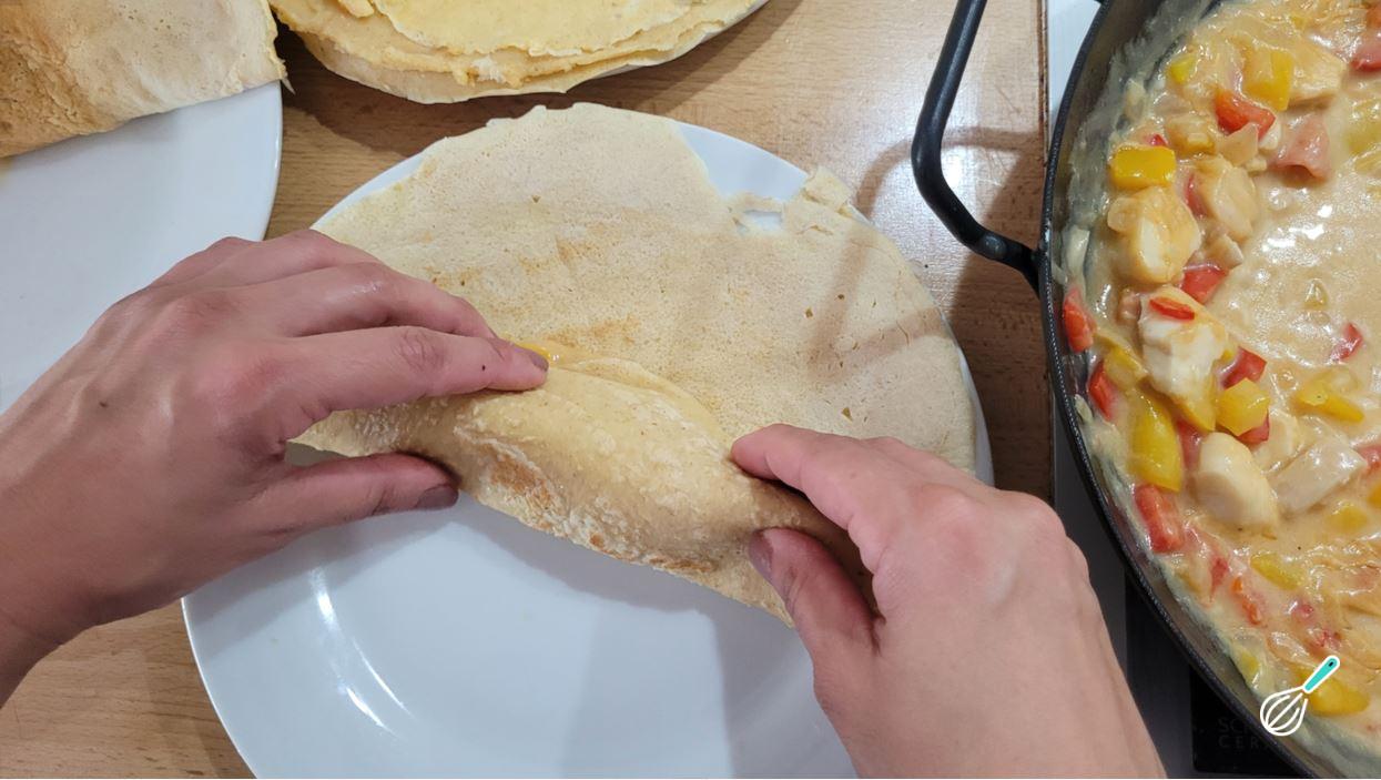 Para rechear, coloque uma porção de recheio em um dos lados da massa e enrole delicadamente para formar a panqueca. Evite colocar recheio demais para conseguir enrolar.