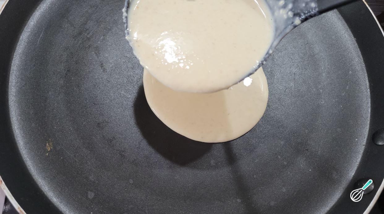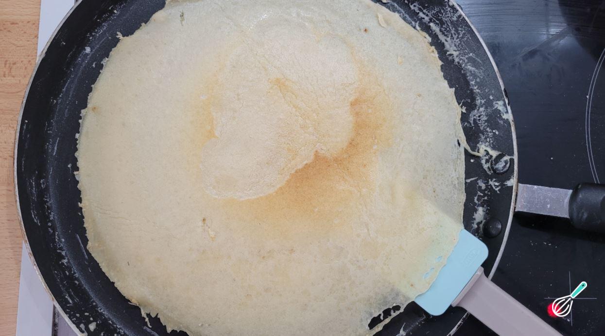 Ligue o fogo e deixe em fogo médio até perceber a formação de pequenas bolhas na massa. A massa também vai começar a soltar nas laterais e quando estiver pronta para virar, ela irá desgrudar naturalmente da frigideira.